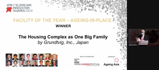 この実践は『従来型の介護の枠』を超えた取り組みとして国内外で注目され、第一回アジア健康長寿イノベーション賞でアジア準大賞・国内最優秀賞を受賞。さらに、8th Eldercare Innovation Awards 2020 において、最優秀賞「FACILITY OF THE YEAR - AGEING-IN-PLACE」を受賞しています。