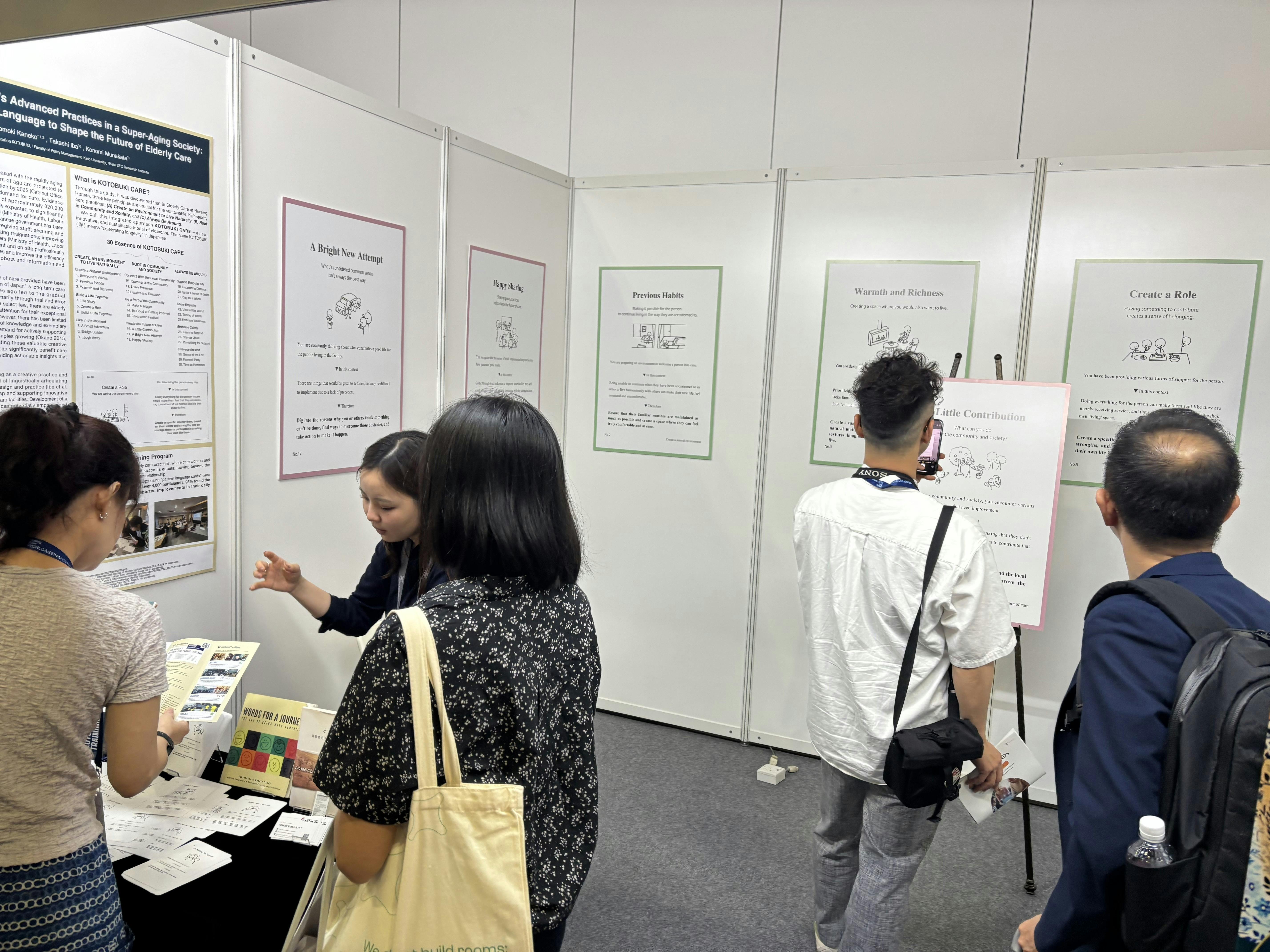 「私たちは日本から来た研究者です。日本は世界の中でも高齢化が進む国で、そこでは多くの実践と学びが積み重ねられています。私たちのブースでは、その中で培われてきた“ケアの哲学”を世界に届けにきました。」