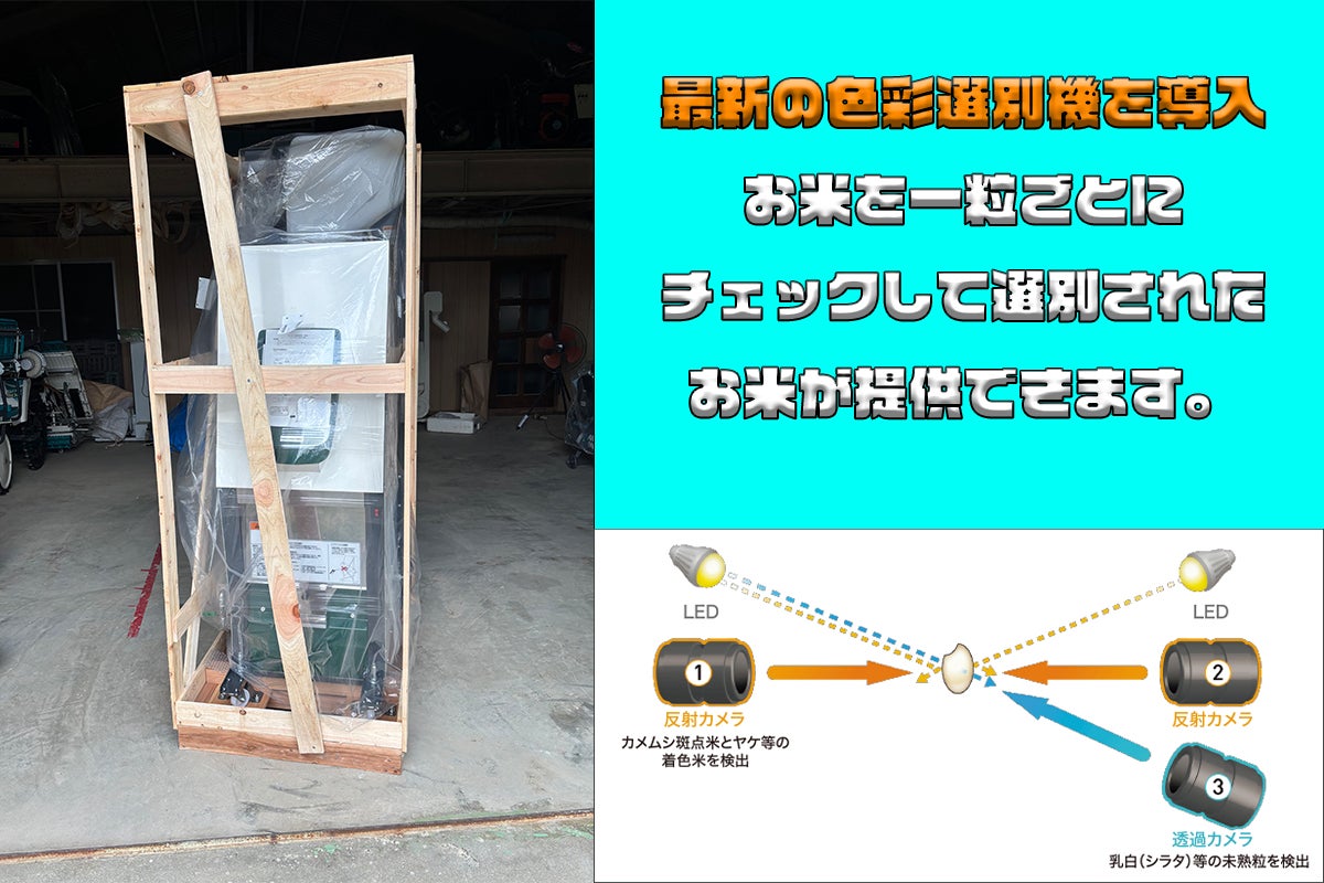 今年は新たな設備として400万円を投入して、安くて美味しく綺麗なお米を提供するために色彩選別機を導入しました。これは米の色をレーザーで識別して未登熟米や暑さで焼けたお米、カメムシ被害にあったお米を一粒ずつ取り除く機械です。