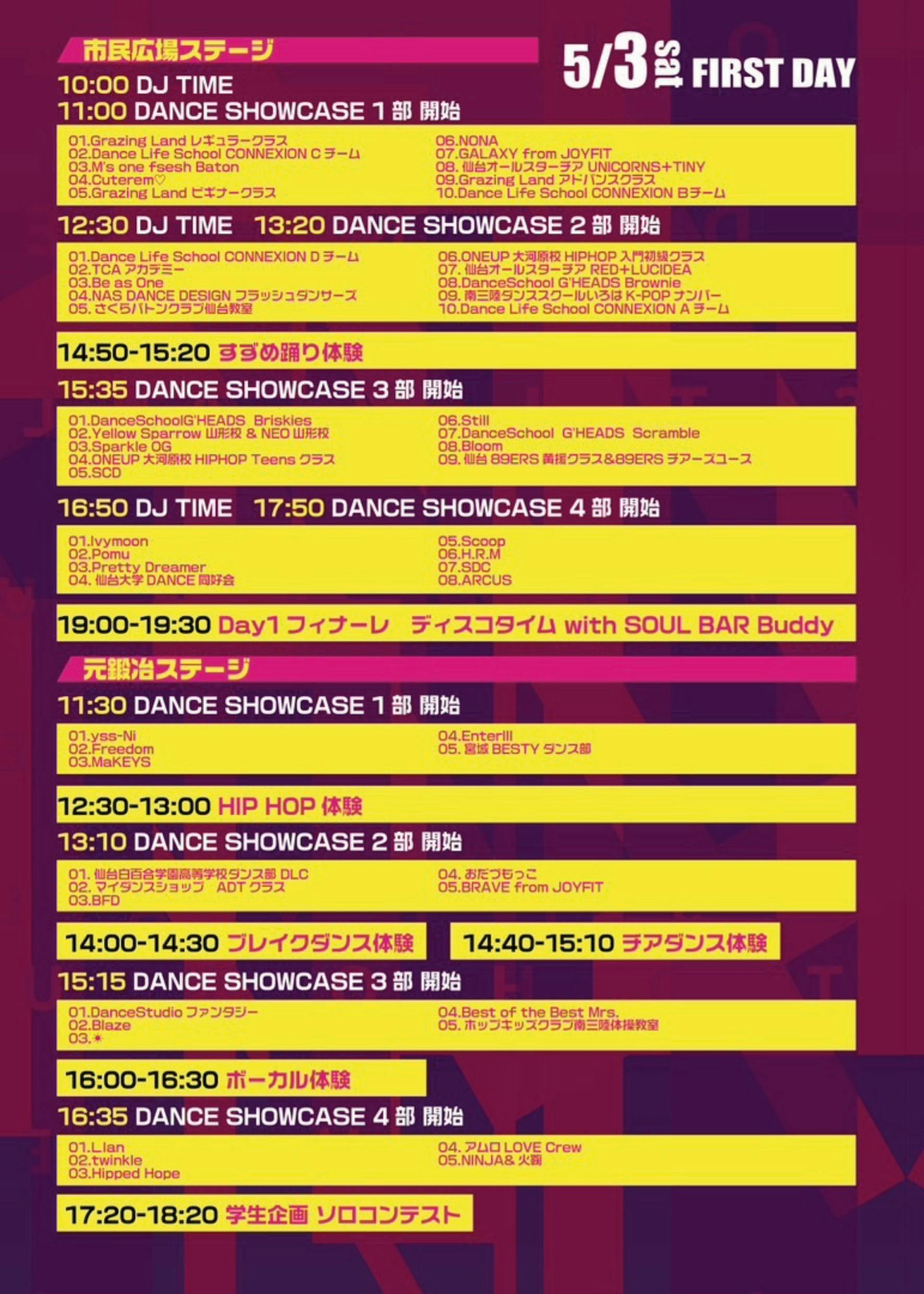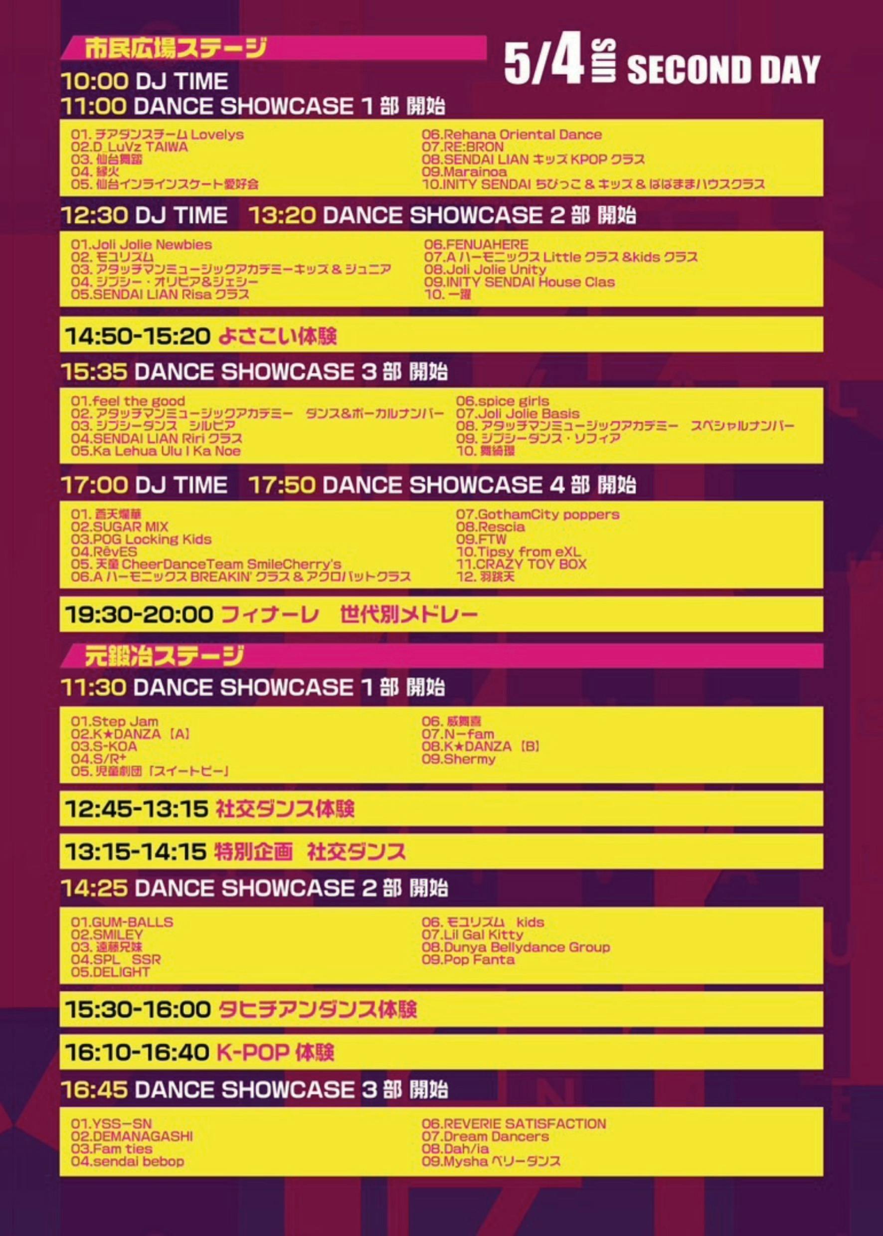 2025/04/30 04:50東北ダンスフェスティバルの楽しみ方、その1をご紹介いたします。東北ダンスフェスティバルでは「レクチャーステージ」という企画を行っております。「DANCEレクチャー」、「体験型ステージ」と呼ぶこともありますが、これはどういうものなのか?ご説明しましょう。会場内の一角で、どなたでもが、予約も料金も不要で、その場のノリで参加できるダンス体験会を、選りすぐりの講師が開催するそんな企画です。めっちゃ楽しそうじゃないですか?そうなんです、毎回盛り上がっているんです!内容はもちろんそんなハードなものではありません。どなたでもが無理なく楽しんでいただけるものですが、ガチで参加してみるのも、さわり程度と思って参加してみるのも、全く皆様の自由です。「何かダンスをやってみたいけど、どんなダンスがあるのかな?」「前々から気になっていたあのダンス、どんな感じかもう少しよく知りたいな?」「会場でステージを見ていたらなんか燃えてきて、このまま帰りたくない!」「なんか盛り上がってて楽しそうだから、混ざってみようかな?」こんな方、歓迎です。お待ちしています。今回は画像のとおり、勾当台公園市民広場と元鍛冶丁公園で、全8種のダンスのレクチャーを行います。チェックの上、是非是非ご参加ください。また、スタンプラリーを行っており、レクチャーに参加するとパンフレットにスタンプがもらえます。その他に「〇〇を探せ!」的なミッションをクリアしてスタンプを揃えると、景品がもらえるという企画になっております。お子様にも楽しんでいただけると思いますので、こちらも是非是非ご参加ください。東北ダンスフェスティバルはステージを見るだけのダンスイベントではなく、来場者の方にもダンスを楽しんでいただけるのが特徴です。まだ他にもそんな企画があるのですが、次回の活動報告でお知らせしたいと思います。 もっと見る