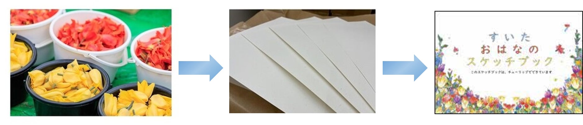 花絵に使用したチューリップを紙(フラワーペーパー)へと再資源化し、スケッチブックをつくります。そのスケッチブックを、ドナルド・マクドナルド・ハウスおおさか健都に寄贈します。寄贈したスケッチブックは、国立循環器病研究センターに長期入院している子どもたちや、そのこどもたちのきょうだい児に提供していただきます。