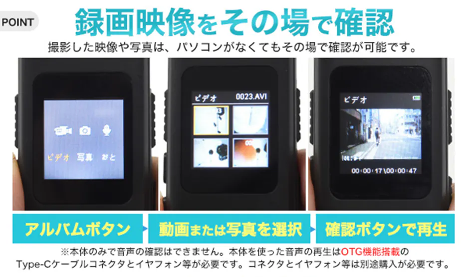 ※本体のみで音声の確認はできません。本体を使った音声の再生はOTG機能搭載のType-Cケーブルコネクタとイヤフォン等が必要です。コネクタとイヤフォン等は別途購入が必要です。