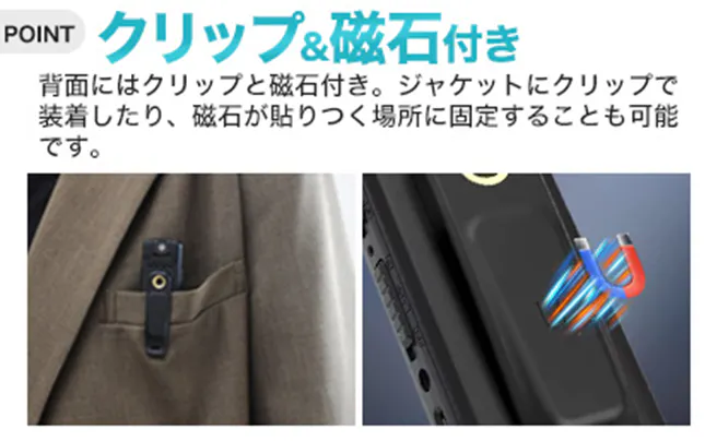 クリップを用いてジャケットの胸ポケットやベルトに装着できます。また磁石が張り付く場所に固定することで定点カメラとしての役割も果たせます。