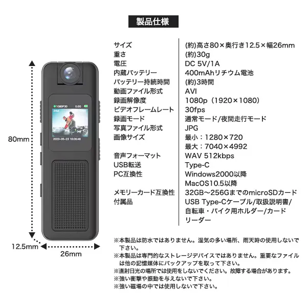※記載の録画・録音時間は最大バッテリー持続時間です。録画・録音時間はmicroSDカードの容量によって異なります。