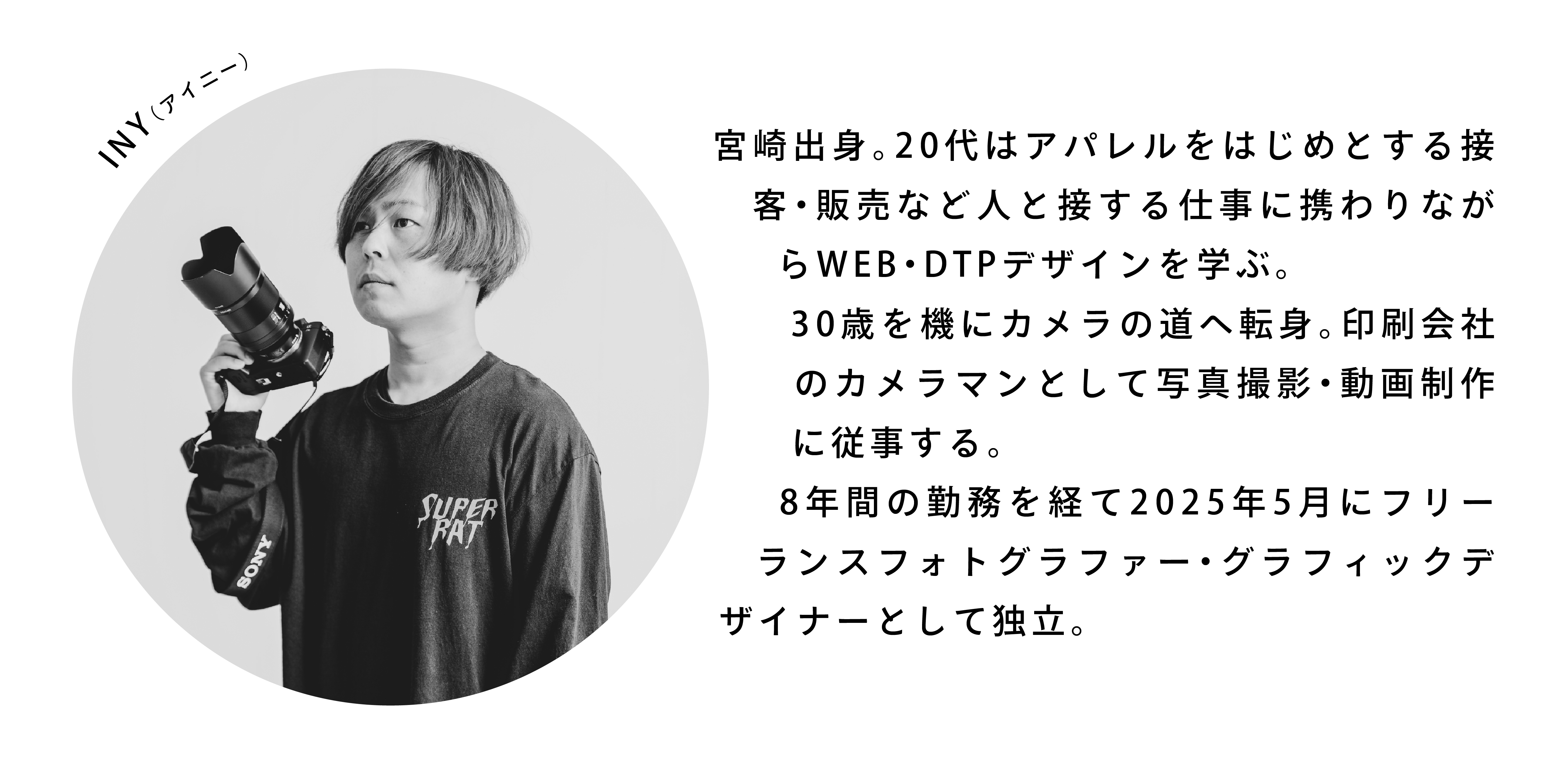 宮崎を拠点に活動しているフォトグラファー・グラフィックデザイナーのINY(アイニー)と申します。