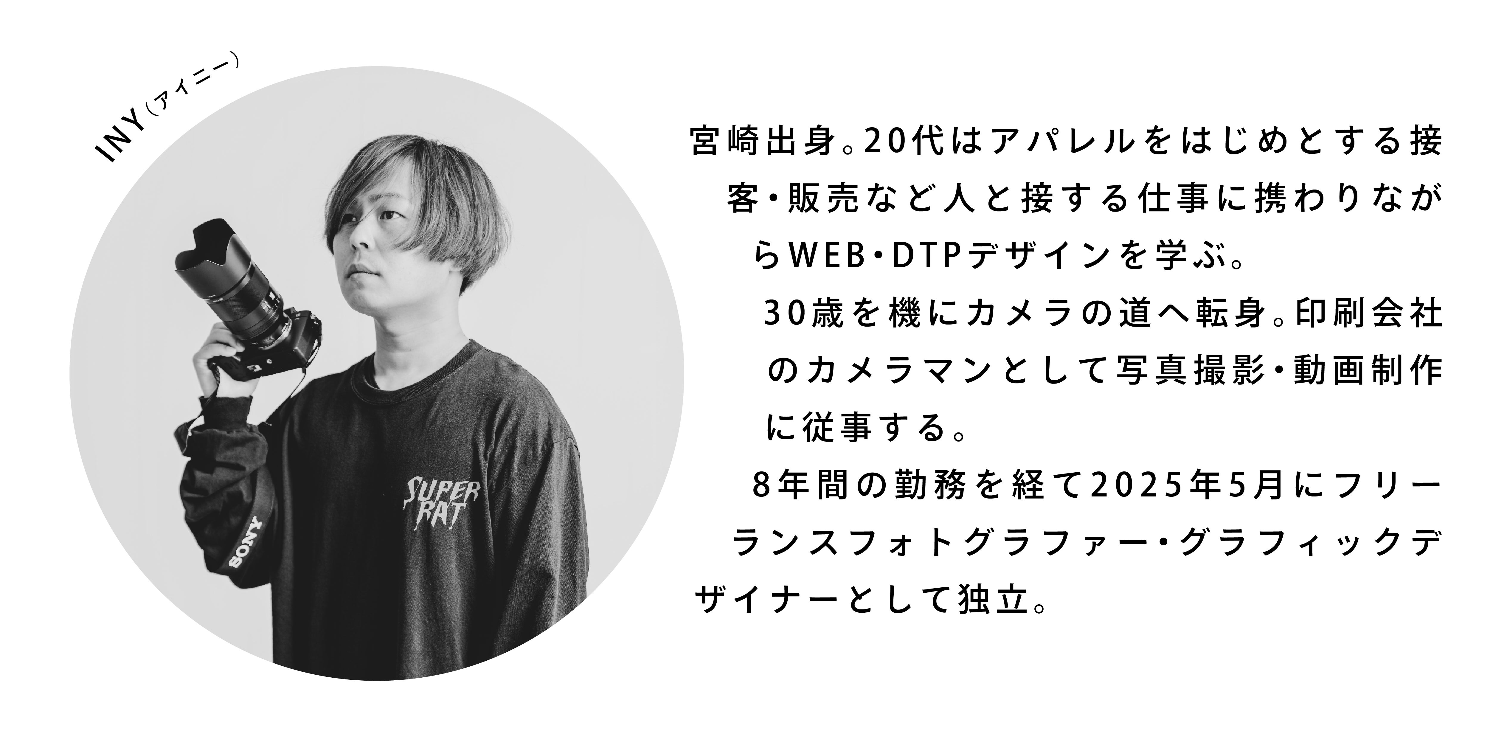 宮崎を拠点に活動しているフォトグラファー・グラフィックデザイナーのINY(アイニー)と申します。