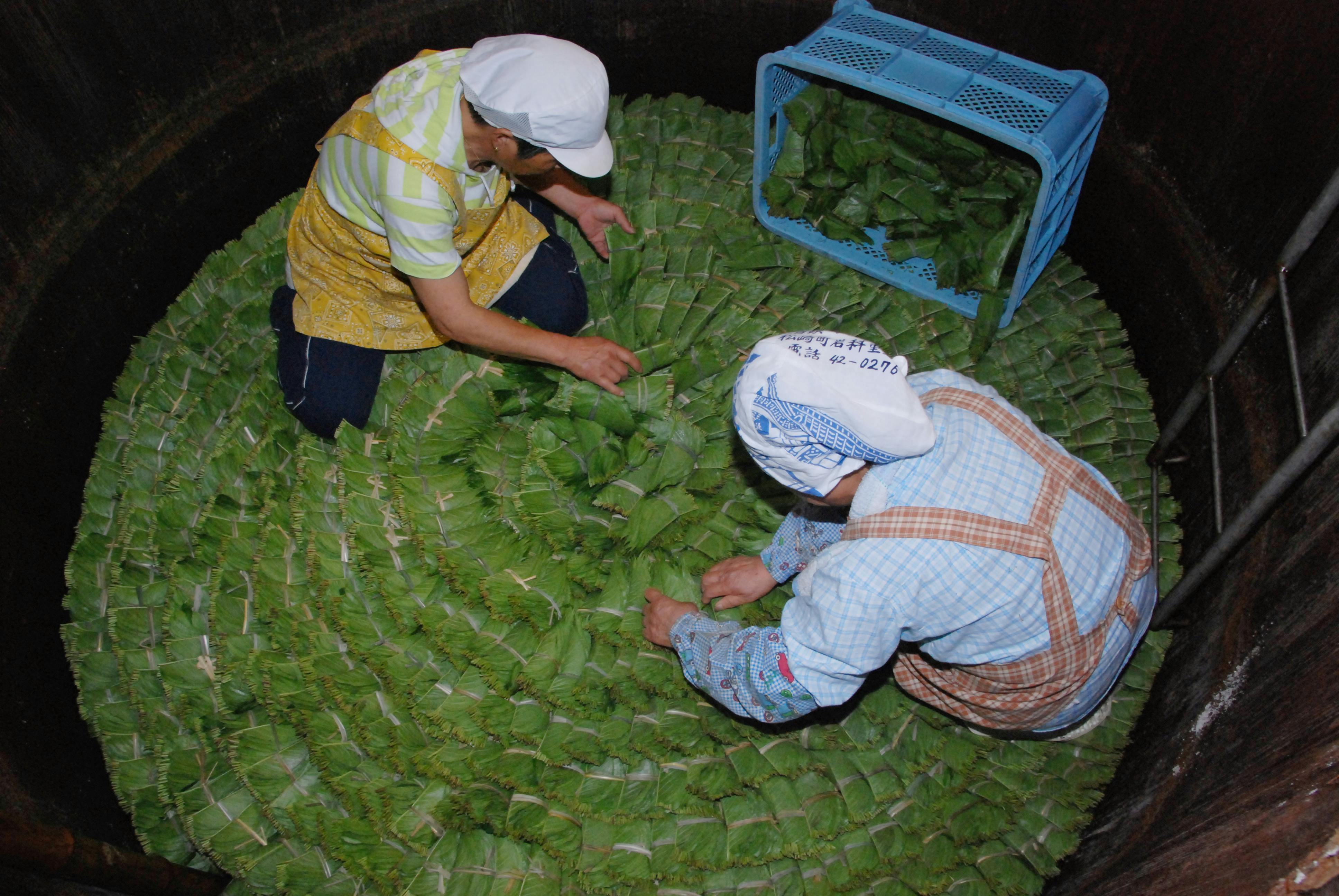 桜葉は、この伊豆松崎町が国内生産量が7割を誇り、オオシマザクラの葉を収穫し、塩漬けにしたものが使用されています。