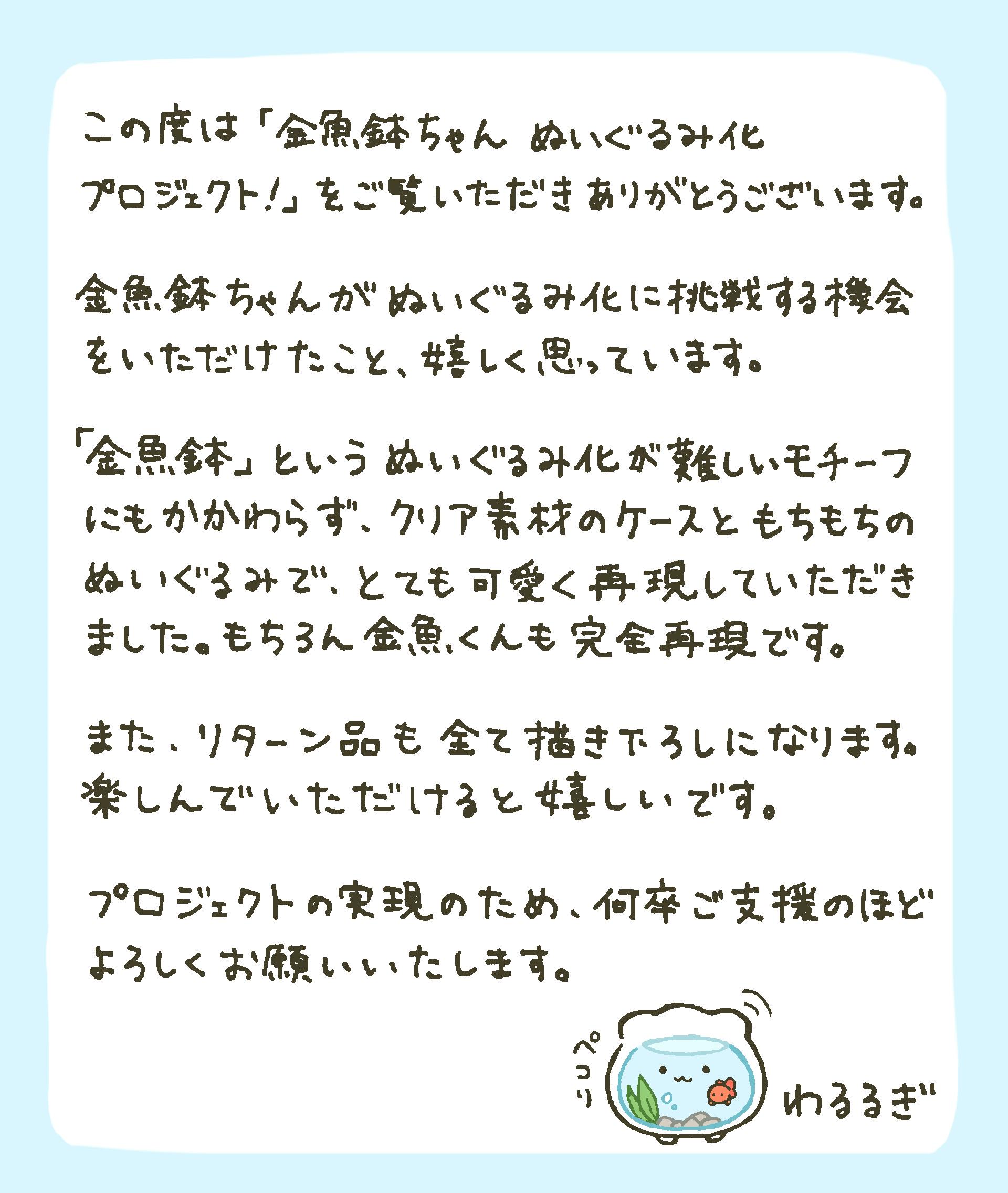 2025/04/28 18:00Creationスタッフです。金魚鉢ちゃんぬいぐるみ化プロジェクト!へのご支援ありがとうございます!皆様のたくさんのご支援のおかげで・・・\\ 商品化が決定いたしました //ここからは受注販売と同じ仕組みになり、ご支援すると必ず商品が届きます!数量限定直筆色紙プランもまだゲットできます!!クラファン終了日は【5月6日 23:59】です!ぜひご支援し忘れのないようご支援よろしくお願いします♪ もっと見る