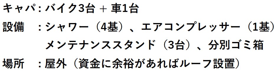 また、車を所有しているライダーも多いと考え、四輪車用の洗車スペースも1台分確保する計画です。