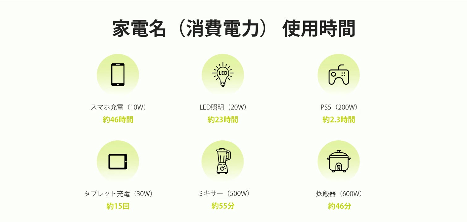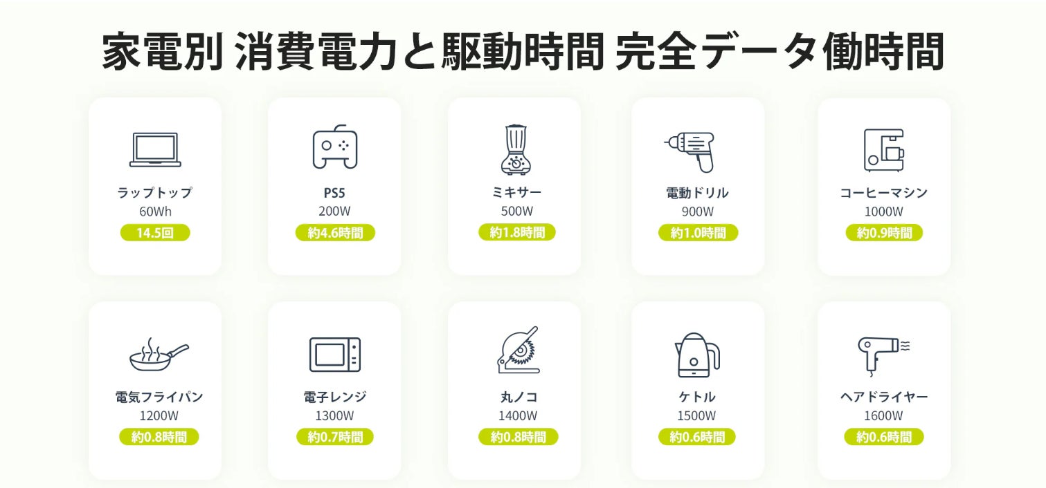 対応機器例:電子レンジ(800W)・冷蔵庫(150W)・電動工具(1800W)・医療機器(300W)