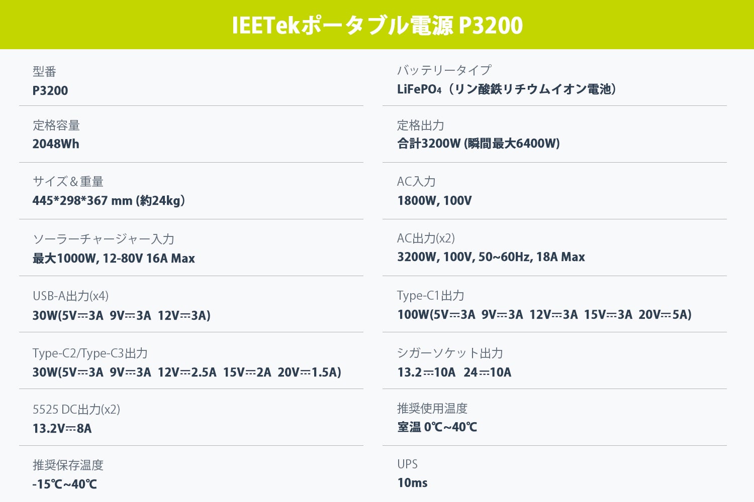 IEETek P3200は、最大3200Wの高出力と2048Whの大容量を誇り、家庭用からアウトドア、非常時の電力供給に至るまで、幅広い用途に対応する理想的なポータブル電源です。