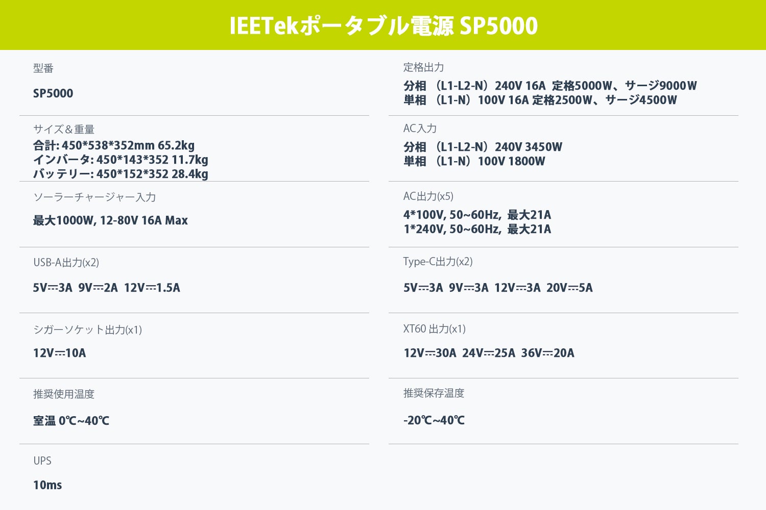 SP5000は、UPS(無停電電源装置)機能を搭載し、停電時にわずか10ミリ秒以内でバックアップ電源へ自動切り替え。電力網に接続した状態で充電可能で、満充電になると自動で充電回路がオフになるため、安心して長期間使用できます。