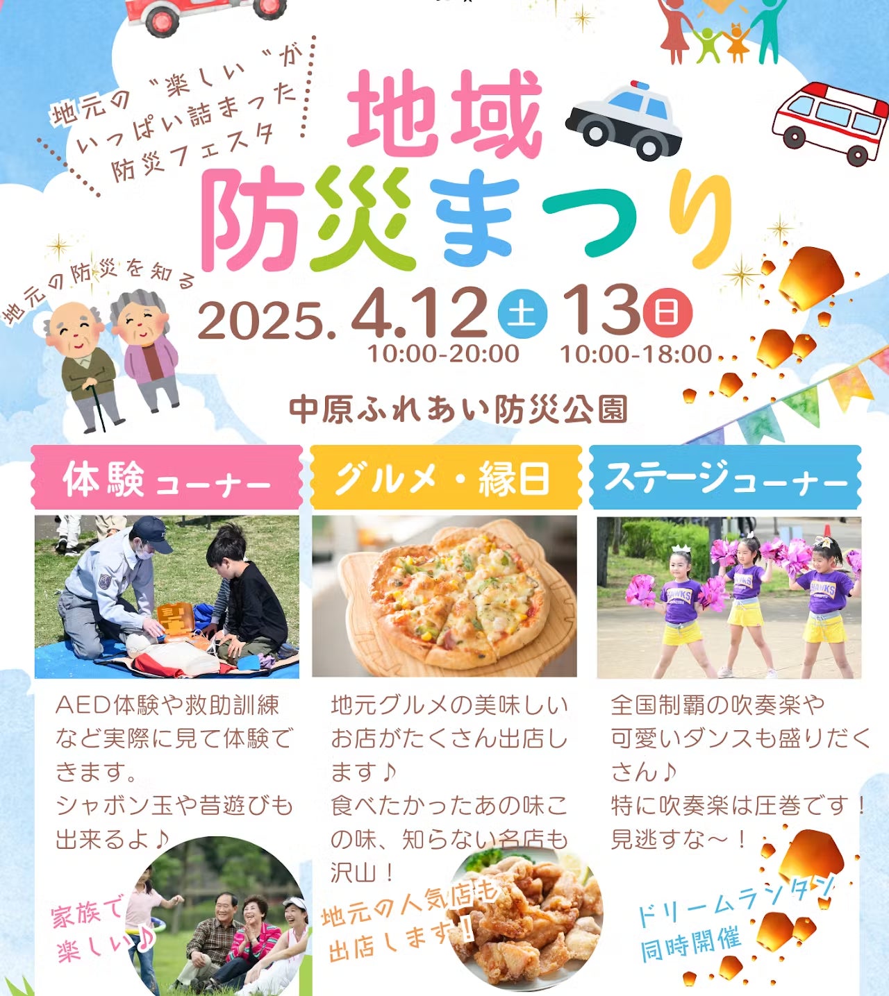 こんにちは。地域防災まつり実行委員会のドリームランタンチームです。今年2024年4月に初開催された中原防災公園(柏市)での地域防災まつりはおかげさまで約3000名もの参加をいただき、大盛況で開催することができました。ご来場いただいた皆さま、出演・出店いただいた皆さま、誠にありがとうございました。