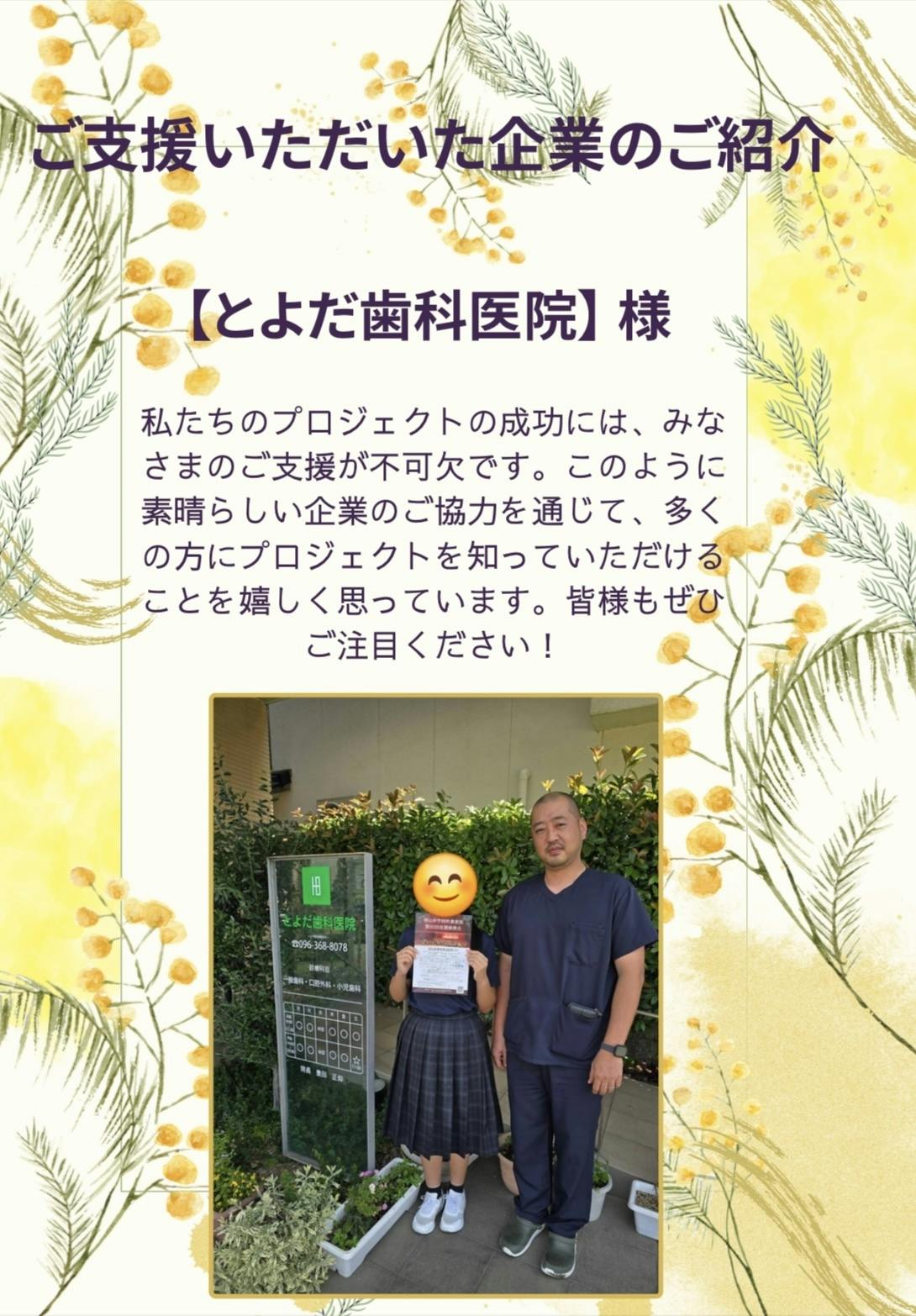 この度、私たちのプロジェクトを支えてくださった皆様心より感謝申し上げます。私たちのクラウドファンディングにご協賛いただいた企業の方との写真をご紹介いたします。