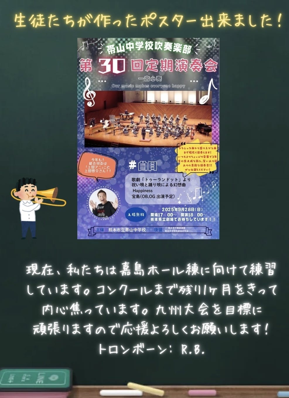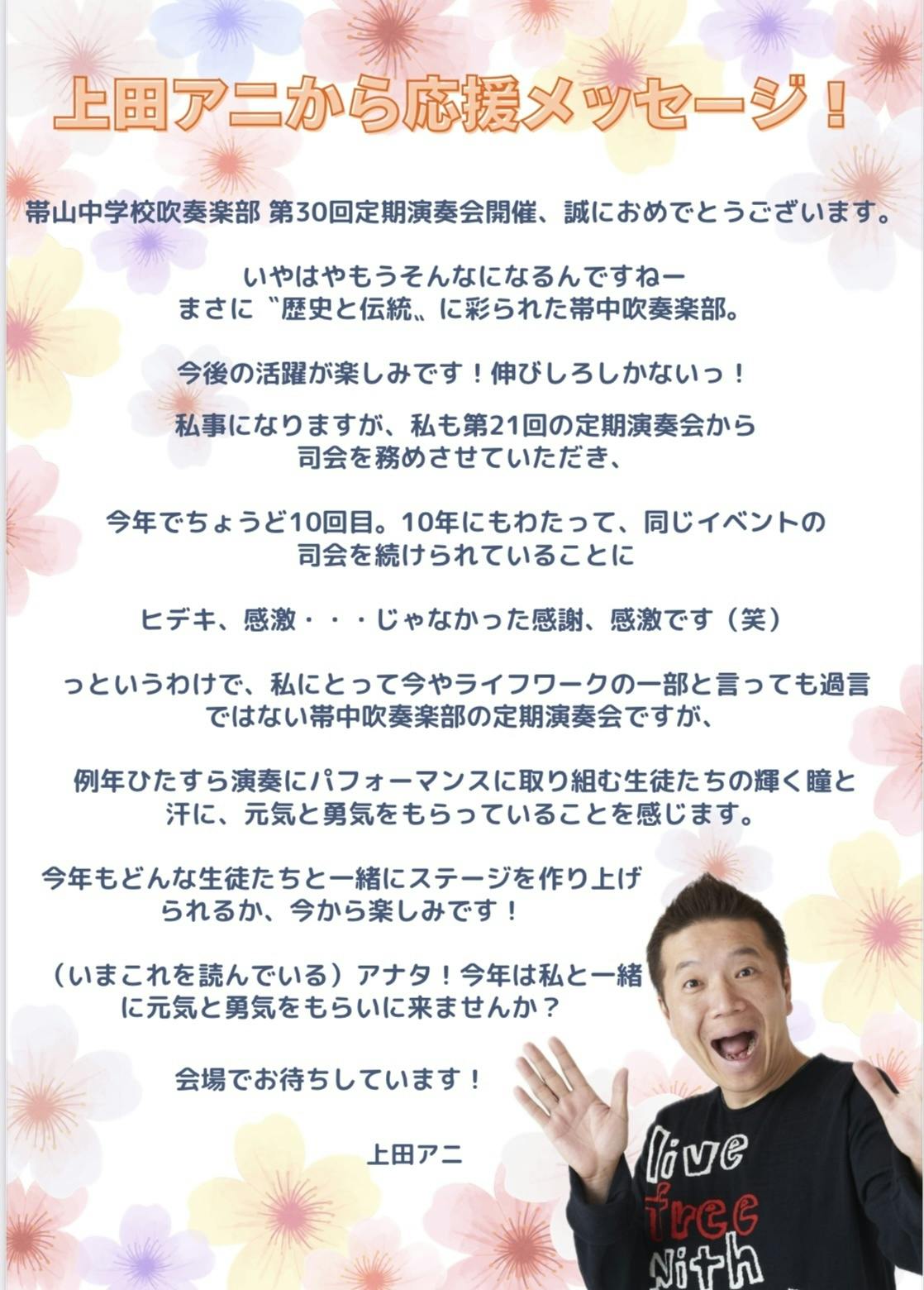 帯山中学校吹奏楽部 第30回定期演奏会開催、誠におめでとうございます。いやはやもうそんなになるんですねーまさに〝歴史と伝統〟に彩られた帯中吹奏楽部。今後の活躍が楽しみです!伸びしろしかないっ!私事になりますが、私も第21回の定期演奏会から司会を務めさせていただき、今年でちょうど10回目。10年にもわたって、同じイベントの司会を続けられていることにヒデキ、感激・・・じゃなかった感謝、感激です(笑)っというわけで、私にとって今やライフワークの一部と言っても過言ではない帯中吹奏楽部の定期演奏会ですが、例年ひたすら演奏にパフォーマンスに取り組む生徒たちの輝く瞳と汗に、元気と勇気をもらっていることを感じます。今年もどんな生徒たちと一緒にステージを作り上げられるか、今から楽しみです!(いまこれを読んでいる)アナタ!今年は私と一緒に元気と勇気をもらいに来ませんか?会場でお待ちしています! 上田アニ