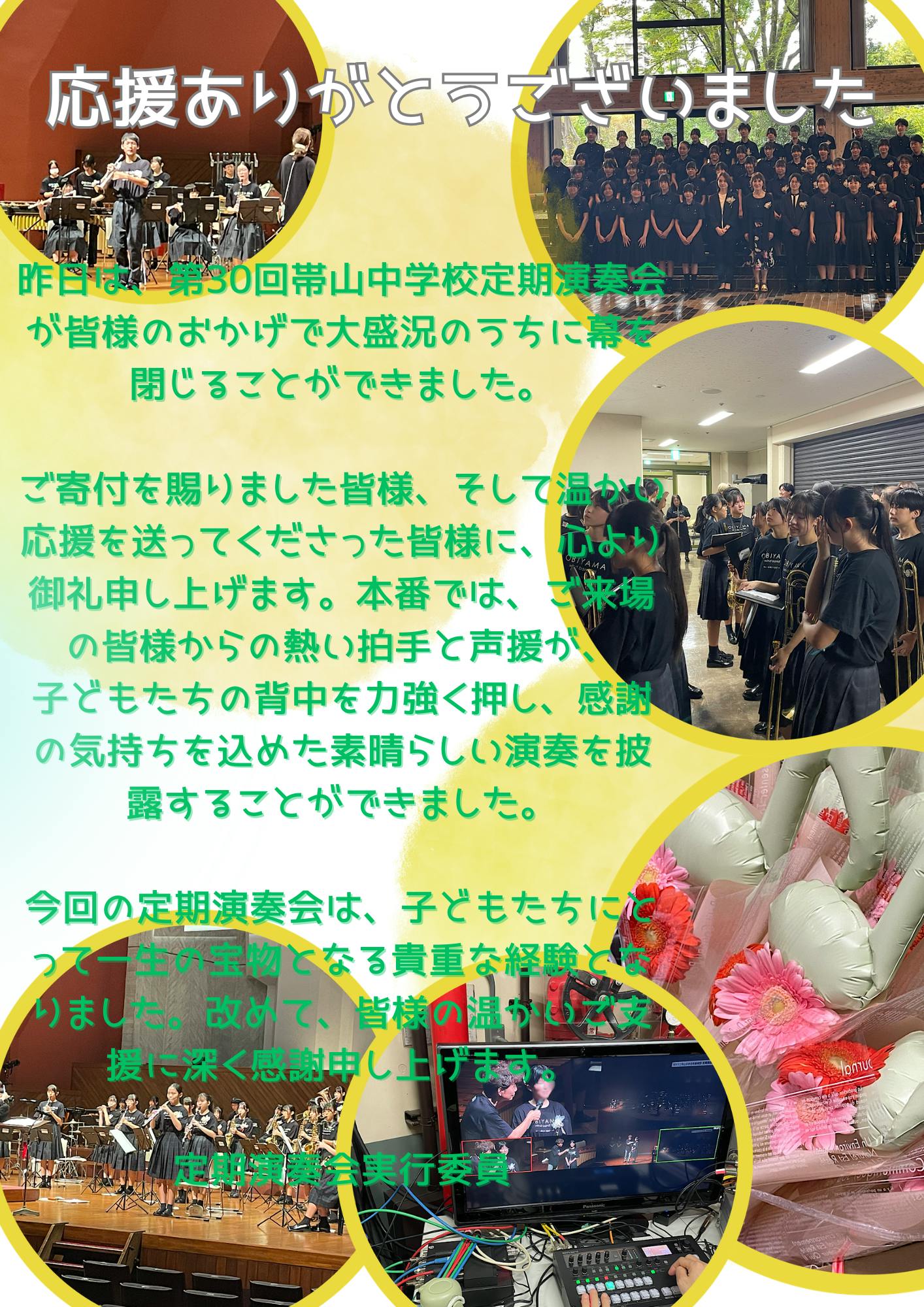 2025/09/29 12:37昨日は、第30回帯山中学校定期演奏会が皆様のおかげで大盛況のうちに幕を閉じることができました。ご寄付を賜りました皆様、そして温かい応援を送ってくださった皆様に、心より御礼申し上げます。本番では、ご来場の皆様からの熱い拍手と声援が、子どもたちの背中を力強く押し、感謝の気持ちを込めた素晴らしい演奏を披露することができました。今回の定期演奏会は、子どもたちにとって一生の宝物となる貴重な経験となりました。改めて、皆様の温かいご支援に深く感謝申し上げます。定期演奏会実行委員 もっと見る