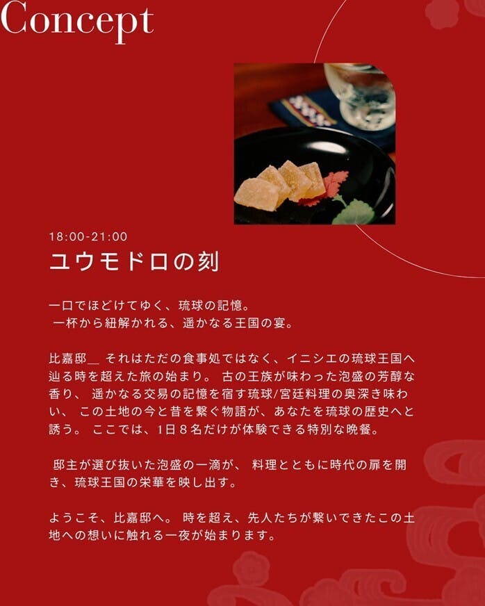 「比嘉邸」は、沖縄の豊かな歴史文化を飲食体験通して触れることのできる、会員制レストラン&BARです。ここを訪れた方々が飲食体験通して沖縄の文化や歴史を深く知り、琉球の物語に触れることができる特別な空間にしたいと考えています。泡盛をただ味わうだけでなく、その背景にある歴史や文化、琉球~沖縄の土地で受け継いできた伝統を理解することで、沖縄の魅力をより深く感じていただけるようおもてなしいたします。泡盛と料理のペアリング、沖縄の言葉や風習、おもてなしの精神など、ここでしか味わえない体験をご提供したいと考えています。