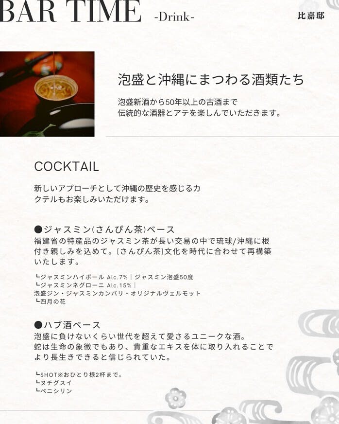 比嘉邸では、お客様により深く沖縄の食文化を味わっていただくために、18時~21時はペアリングコースの提供となります。