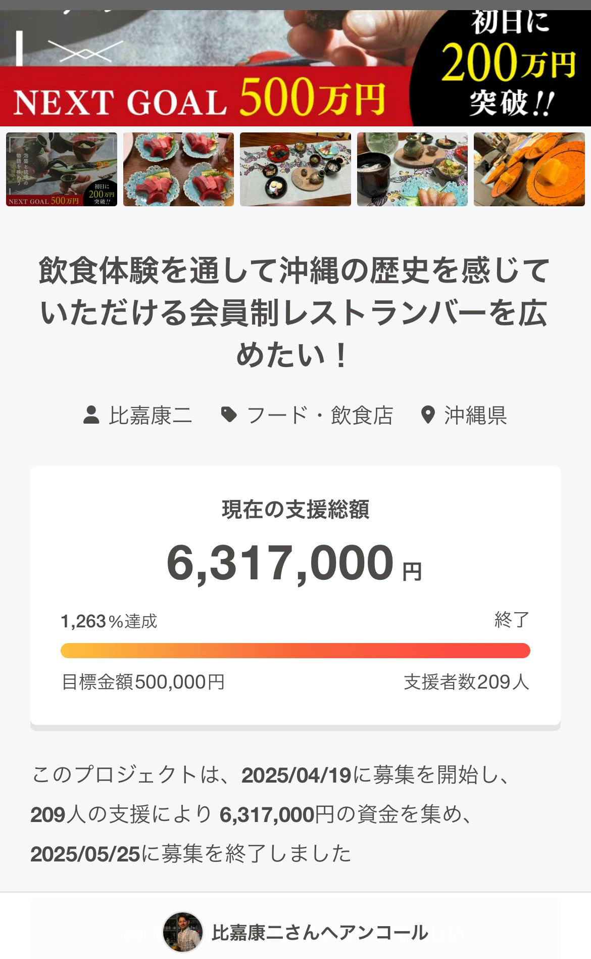 2025/05/25 16:51#005 ➡感謝の1000%越えm(__)m➡質問になんでも答えるインスタライブ※本日18時より約1ヶ月に皆様に支援のお願いをスタートしてあっという間に最終日を迎えております。これまで私たちのチャレンジを応援してくださった皆様、本当にありがとうございます。この文章を書いている17時時点で当初目標の50万円から1000%越えの500万円を突破!!皆様の温かいご支援とメッセージに心からの感謝と、気が引き締まる思いで準備を進めております。肝心の工事の進捗ですが(想定通りに)遅れておりますが、妥協せず比嘉邸の想いをしっかりと落とし込んだ空間を作っていただいております。空家賃や、追加の100万を超える施工費などでドキドキしていたのですが、皆様のご支援で妥協なく準備を進めることができております。お礼と進捗報告を兼ねて本日18時より30分ほど、比嘉康二のInstagramアカウントよりライブ配信を行います。クラファンの仕組みや、皆様から頂いているご質問にお答えいたします。タイミング合いましたら是非ご覧ください。※アーカイブも残します。https://www.instagram.com/kojihiga比嘉邸比嘉康二※会員登録でご支援いただいた皆様へクラファン終了後、5月中に会員登録の方法をご案内いたしますので、お楽しみに。また、ご予約は6月に入ってから受け付けをスタートいたします。 もっと見る