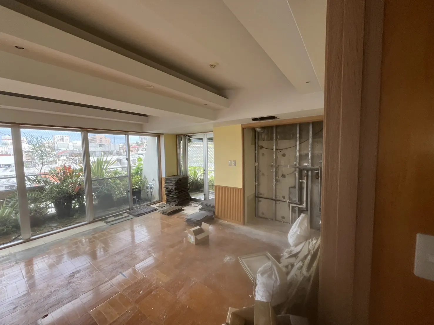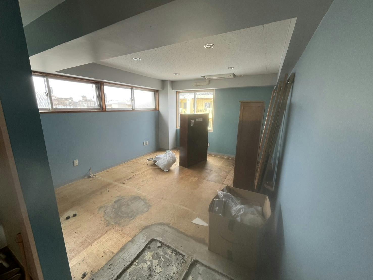 比嘉邸の新しい拠点となる5階の工事が、少しずつ動き始めています。現在は、バースペースと個室スペースの解体作業が無事に完了し、空間がすっかり姿を現しました。