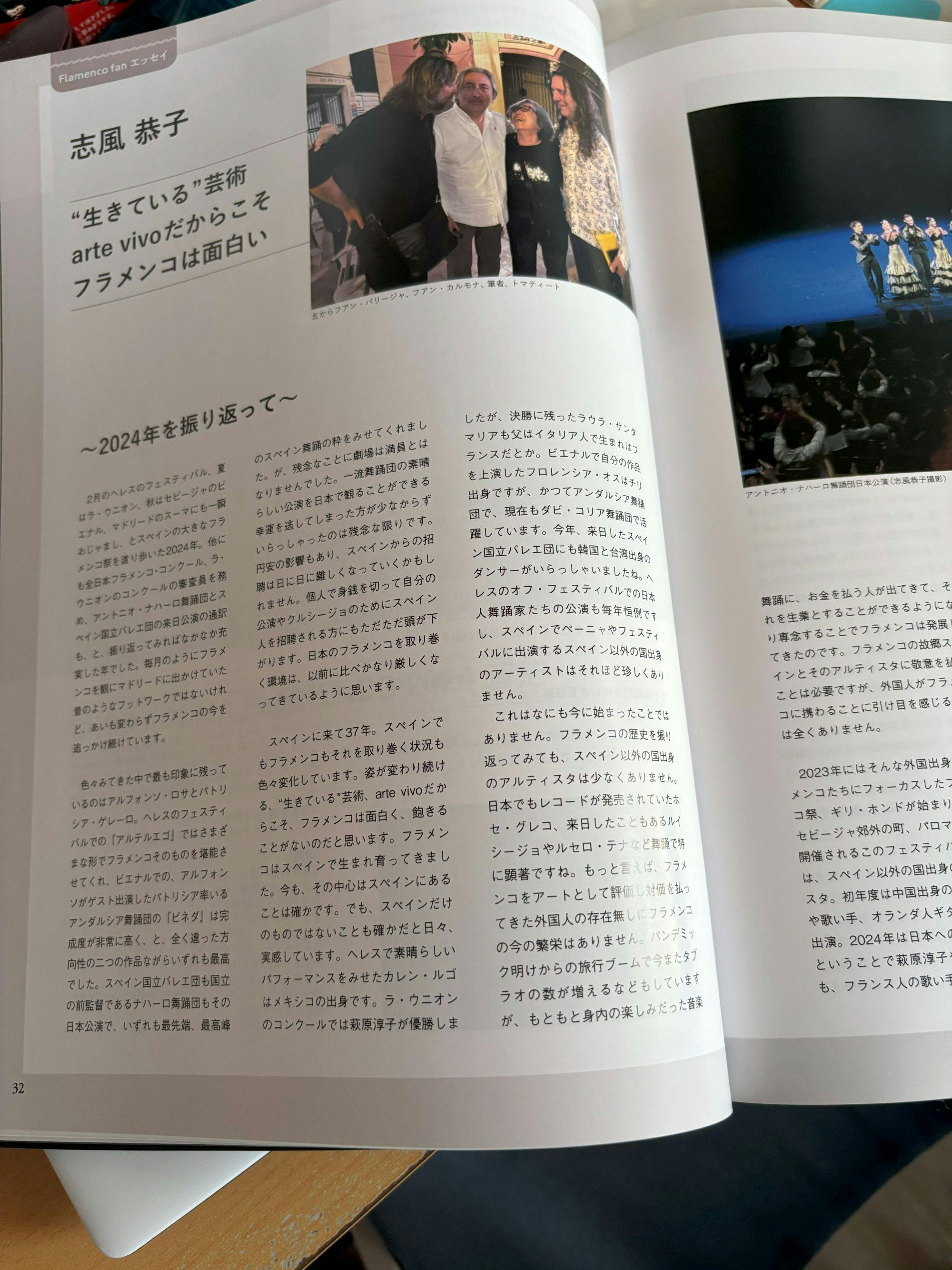 2025/03/26 11:28当プロジェクトをご覧いただき、ありがとうございます!いよいよ締切まで残り5日間となりました。これまで多くの方にご支援いただき、本当にありがとうございます。目標金額に少しでも近づけるよう、ひとりでも多くの方にこの単行本をお届けしたいと思っていますので、ぜひご支援や拡散のご協力をいただけるとうれしいです。昨日から、この年鑑に掲載されているコンテンツを1つずつご紹介し始めました。本誌では日本のフラメンコの現場に関わる人々の活動を、様々な角度から取り上げています。今回は、フラメンコ公演の10本のレポートについてご紹介します。2. 公演10選昨年はスペインからの来日公演や日本人アーティストらの舞台など、実に数十以上の公演が行われました。この年鑑ではそれらの中から、特に注目を集めた10本を掲載させていただきました。どれも当社が運営するフラメンコ総合情報サイト「フラメンコファン」のWEBマガジンですでに掲載していますが、スマホで見るとどうしても写真が小さくなってしまうので、今回紙の誌面でメインの写真は大きく掲載させていただきました。昨年大きな話題を集めたマヌエラ・カラスコ来日公演や、スペイン国立バレエ団公演、東京新宿のショーレストランGARLOCHIでのマヌエル・リニャン公演といったスペインからの来日公演。スペイン舞踊家の石井智子さんやアルテイソレラの舞踊団公演。小島章司さん、鈴木敬子さん、中田佳代子さんら日本を代表する舞踊家による作品。そして若手ダンサーとして活躍する中原潤さんら4人の男性舞踊手による作品や、歌でも踊りでも活躍する中里眞央さんのソロ公演を紹介しています。それぞれの公演を観に行かれた方も、どれも観ていない方も、ぜひ写真とともに公演の様子を振り返ったり思い描いたりして、楽しんでいただけたらと思います。 もっと見る