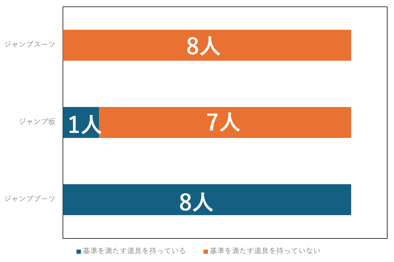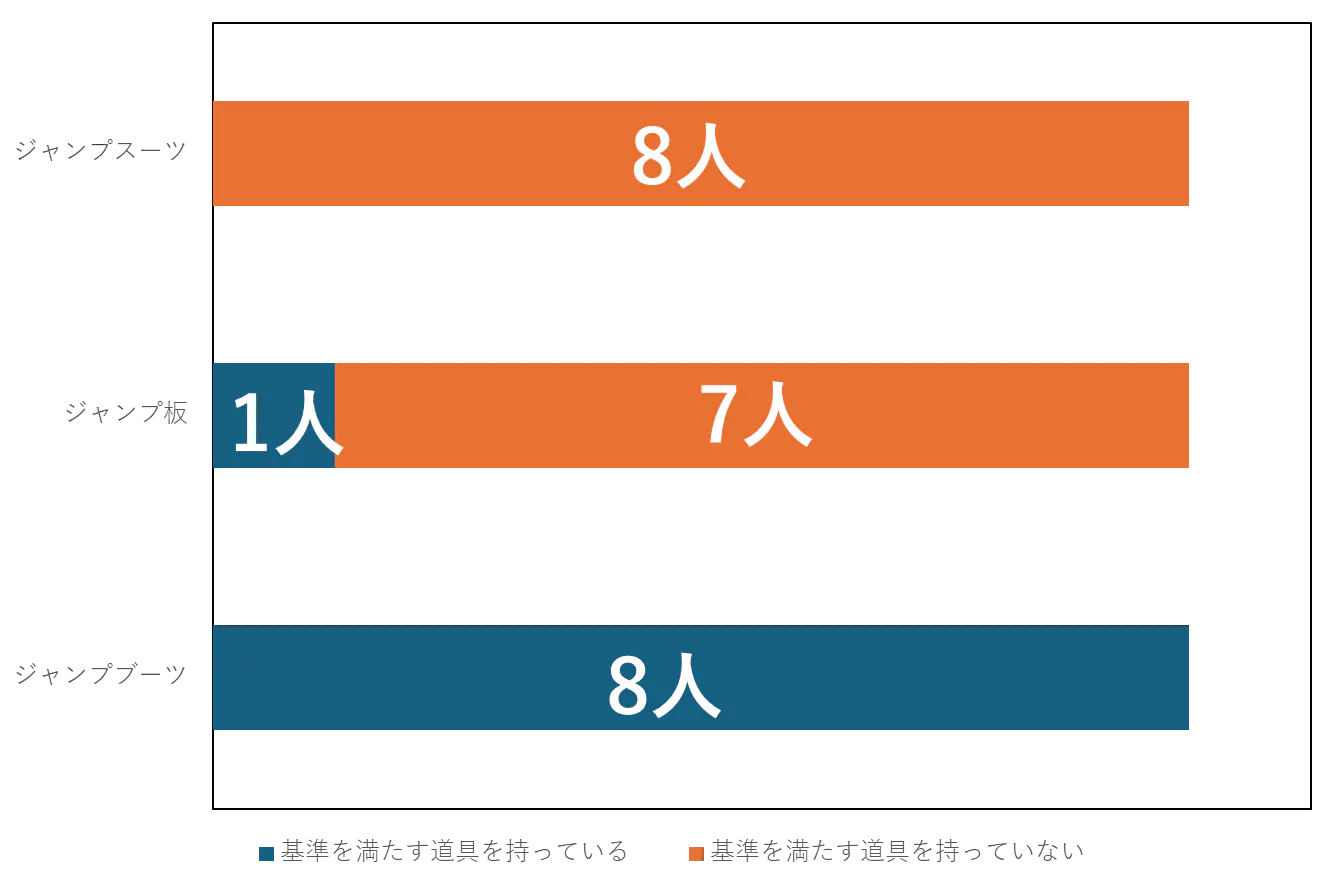 まず、今現在選手が持っている道具で、基準を満たしているもの、満たしていないものの数を下の表にまとめました。ジャンプスーツは、最近規定が変わった影響で、試合に出れるジャンプスーツを持っている人はいません。一方、ジャンプブーツは新しく購入せずとも全員が試合に出ることができます。