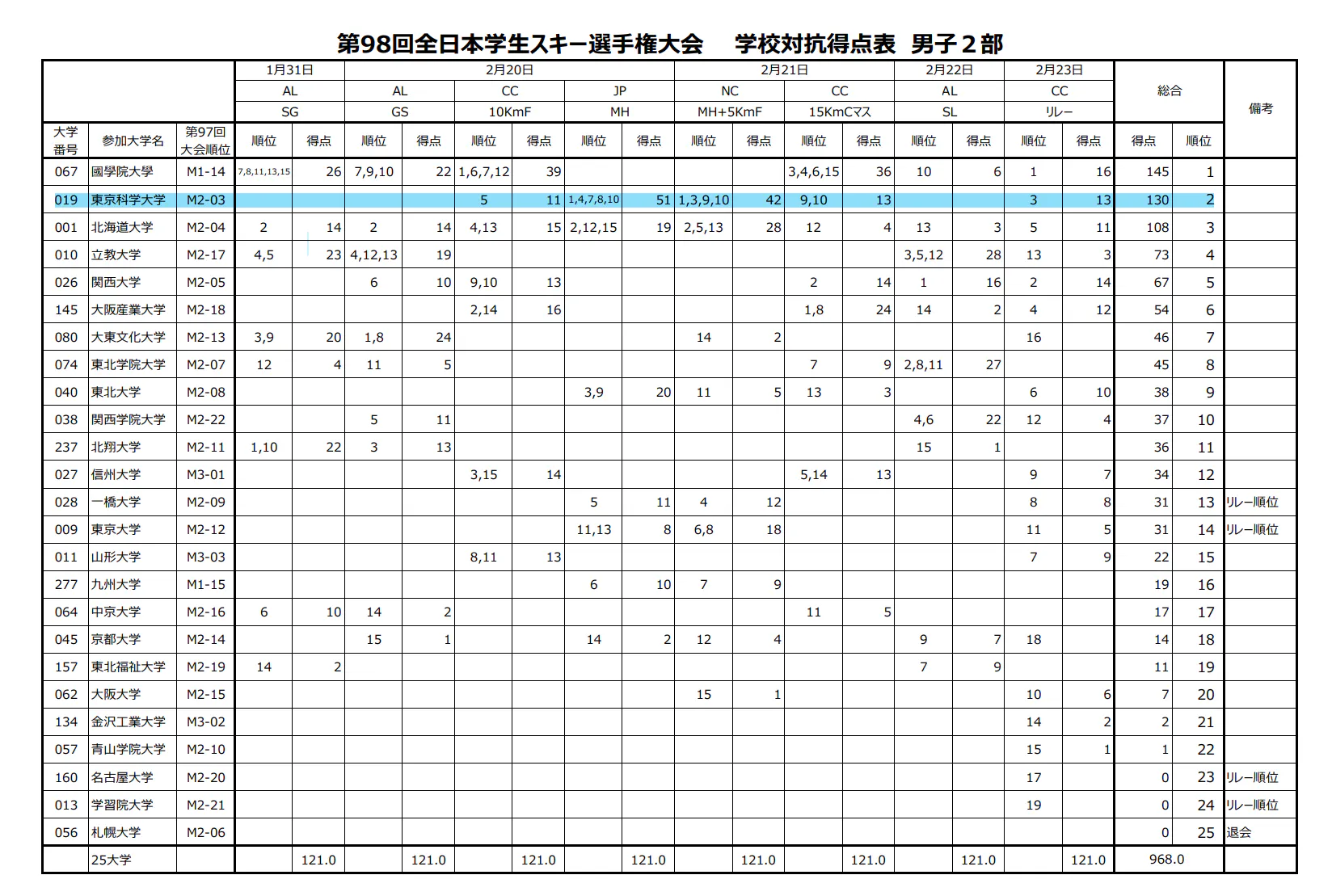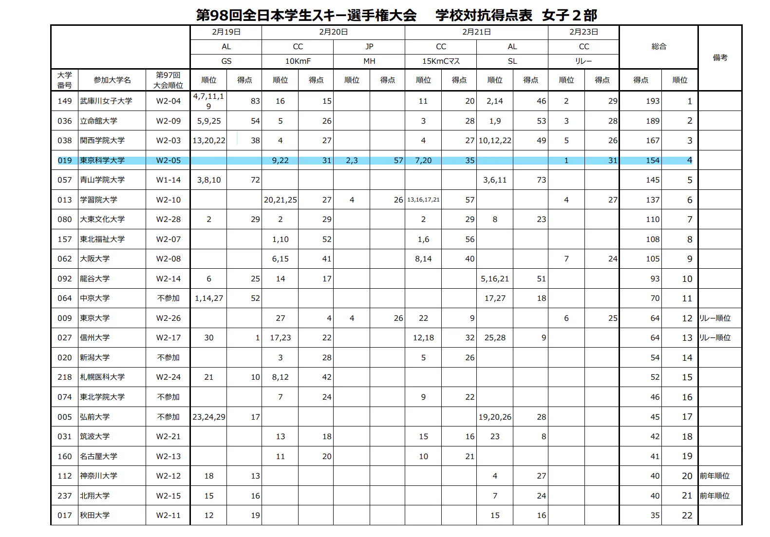 まず初めに、昨シーズンの大会結果を報告させていただきます。秩父宮杯第98回全日本学生スキー選手権大会(インカレ)の結果を以下に掲載します。