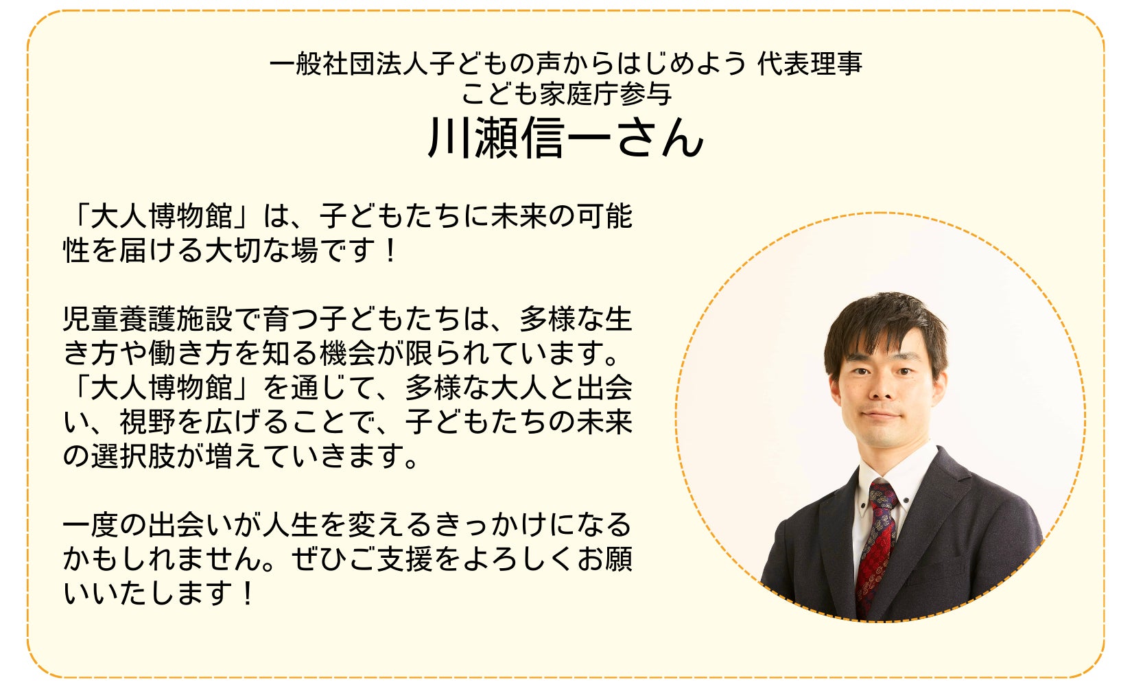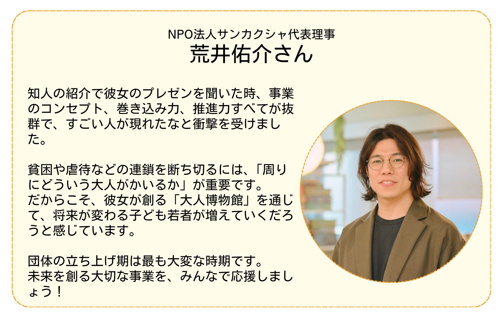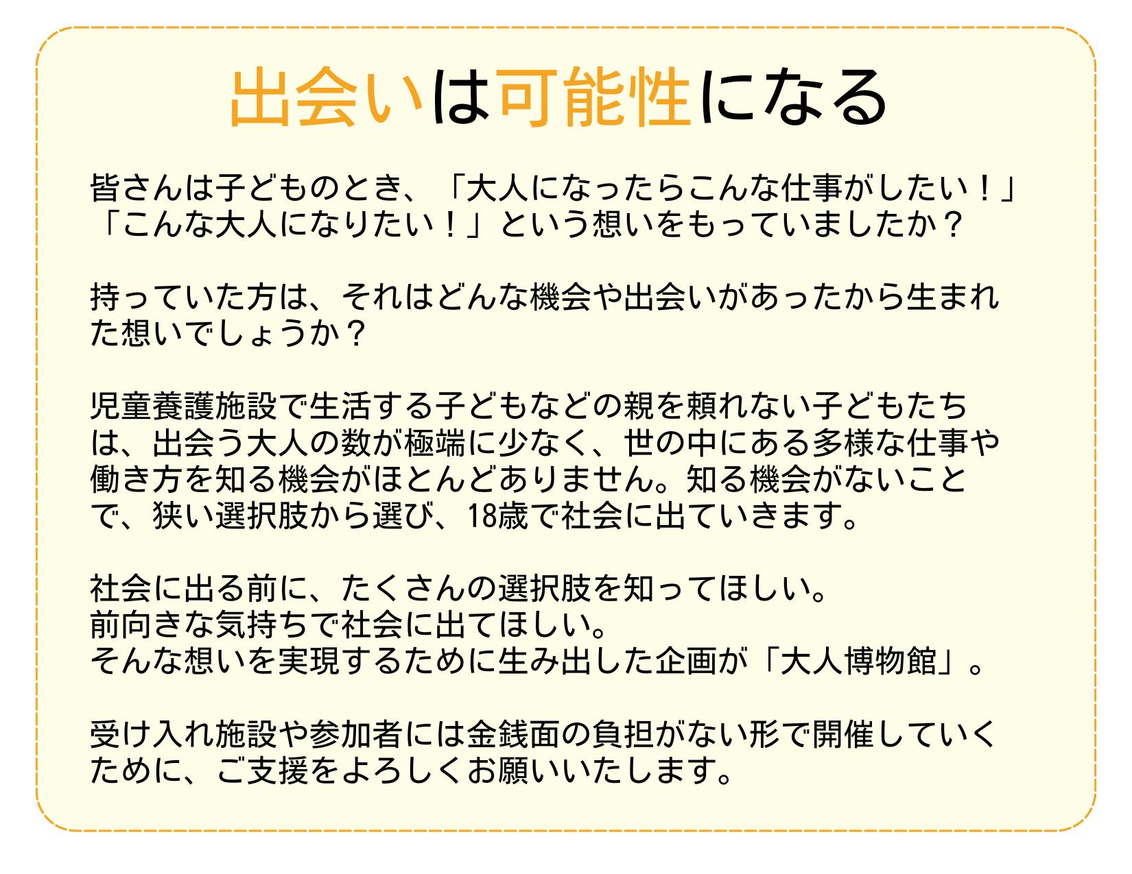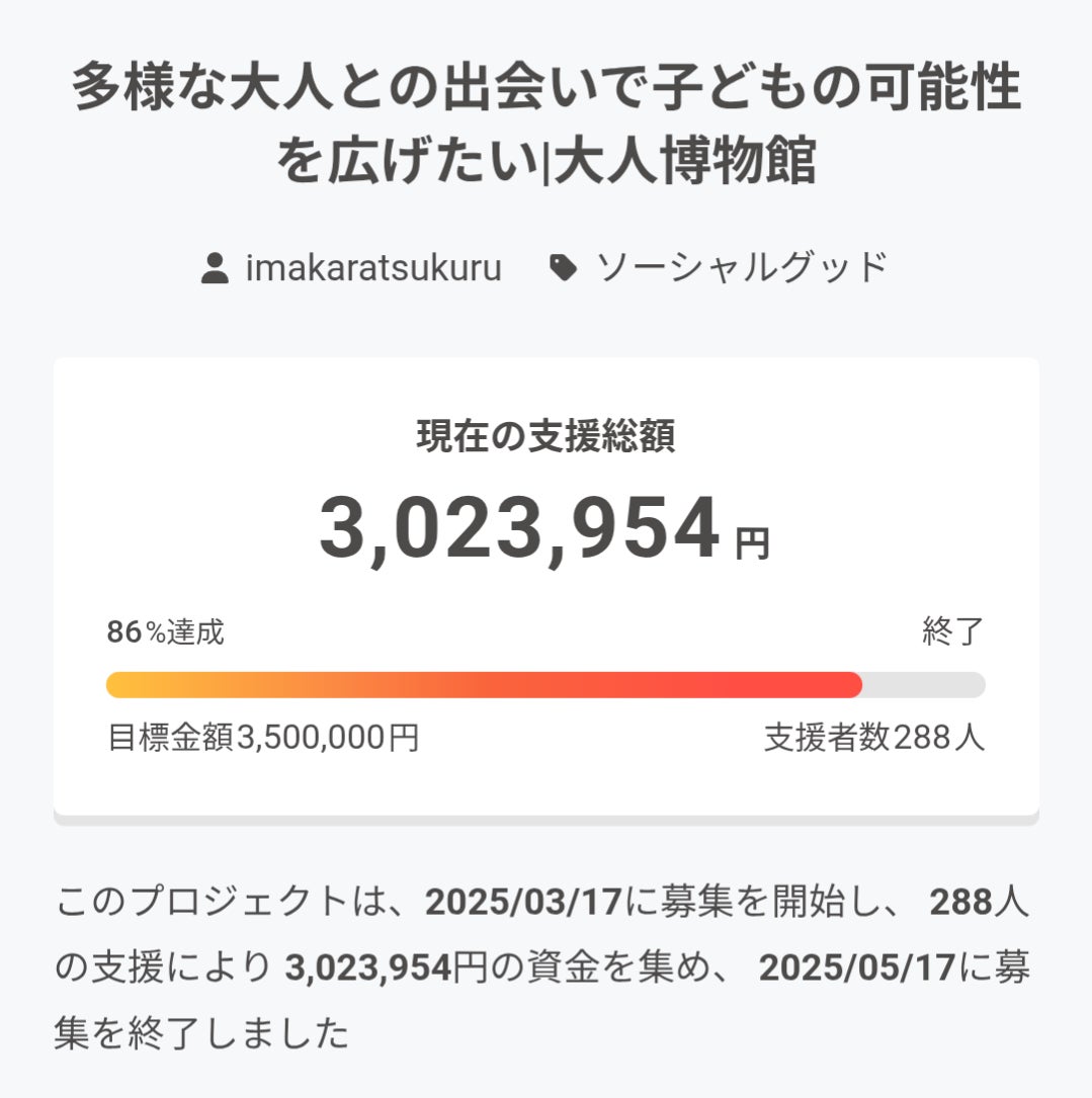 2025/05/18 14:41児童養護施設の子どもたちに色々な働き方、生き方を知って欲しいという想いで立ち上げた「大人博物館」。その活動資金のためのクラウドファンディング、最後まで応援ありがとうございました!!直接ご寄付をいただいた金額を合わせ総額【3,138,014円】のご支援が集まりました!!目標にはあと1歩届きませんでしたが、直接いただいた方も含め、約300人の方が共感、応援してくださっているという事実を何よりも嬉しく思います。そして、ここからが新しいスタートです。子どもたちの可能性を広げるために「大人博物館」を全国の児童養護施設に届けていきます!これからも応援よろしくお願いします!!心より感謝を込めて。一般社団法人いまからつくる代表理事 林めるり もっと見る