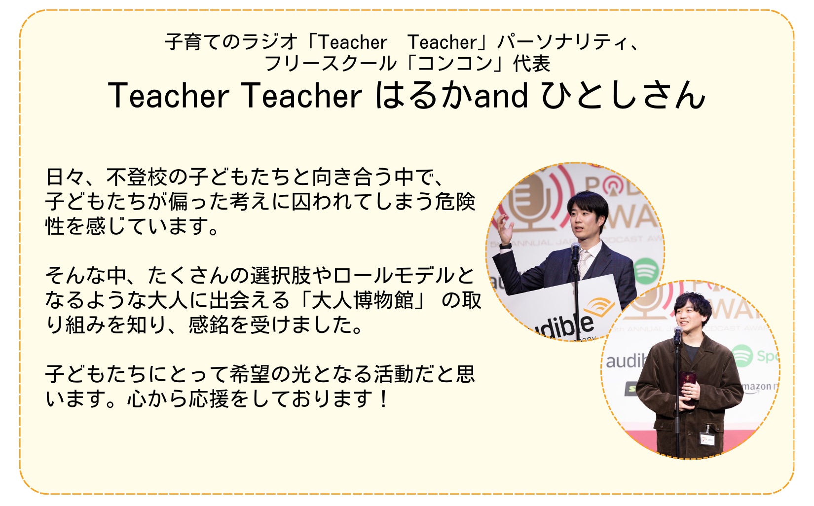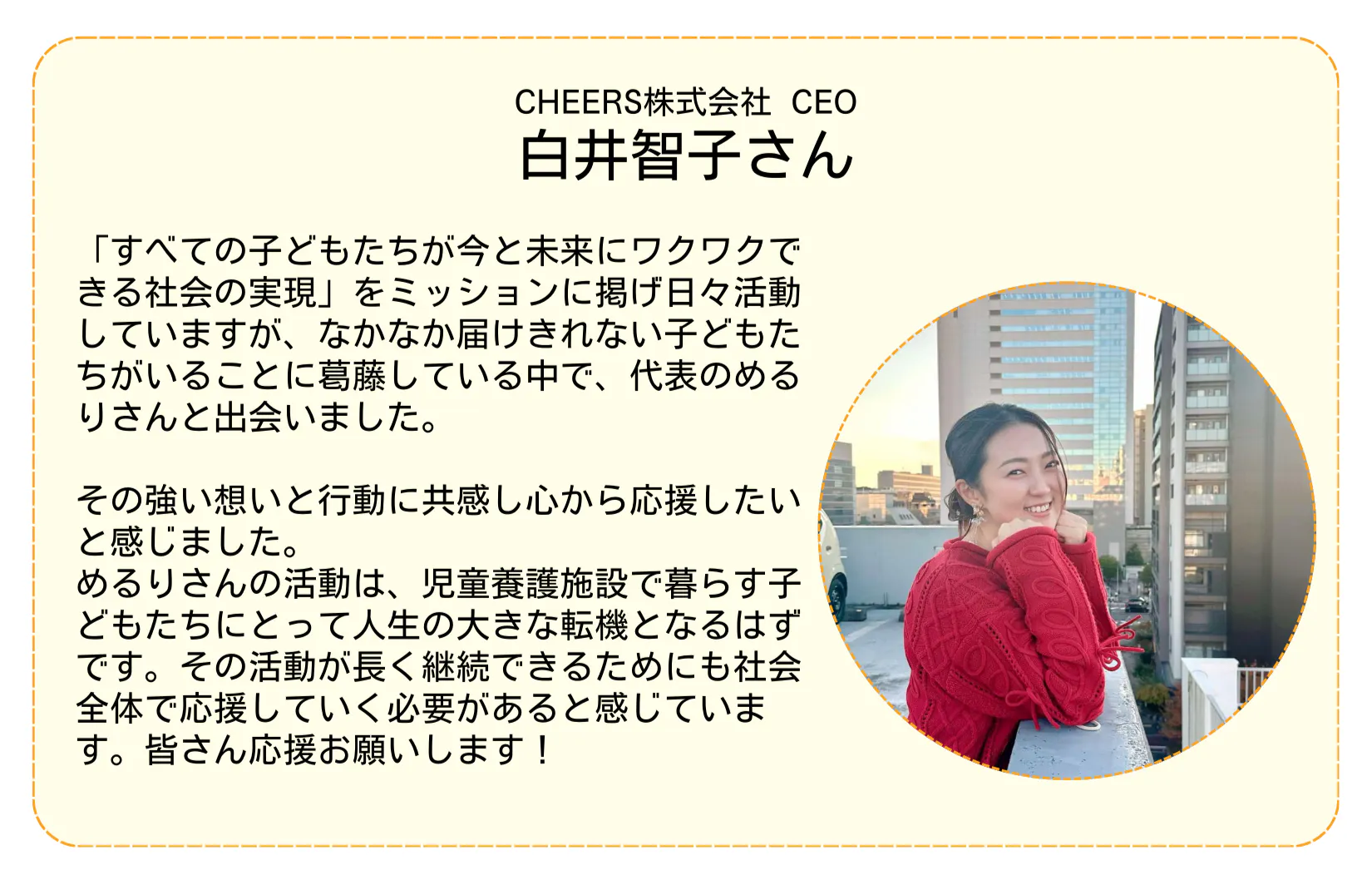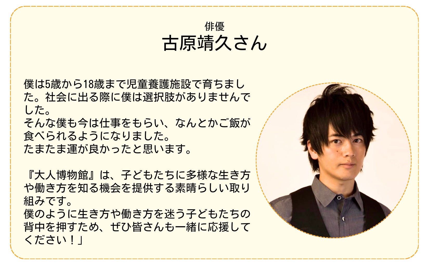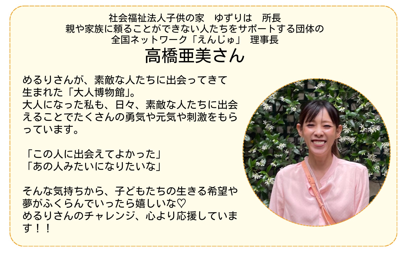 2025/05/18 14:41児童養護施設の子どもたちに色々な働き方、生き方を知って欲しいという想いで立ち上げた「大人博物館」。その活動資金のためのクラウドファンディング、最後まで応援ありがとうございました!!直接ご寄付をいただいた金額を合わせ総額【3,138,014円】のご支援が集まりました!!目標にはあと1歩届きませんでしたが、直接いただいた方も含め、約300人の方が共感、応援してくださっているという事実を何よりも嬉しく思います。そして、ここからが新しいスタートです。子どもたちの可能性を広げるために「大人博物館」を全国の児童養護施設に届けていきます!これからも応援よろしくお願いします!!心より感謝を込めて。一般社団法人いまからつくる代表理事 林めるり もっと見る