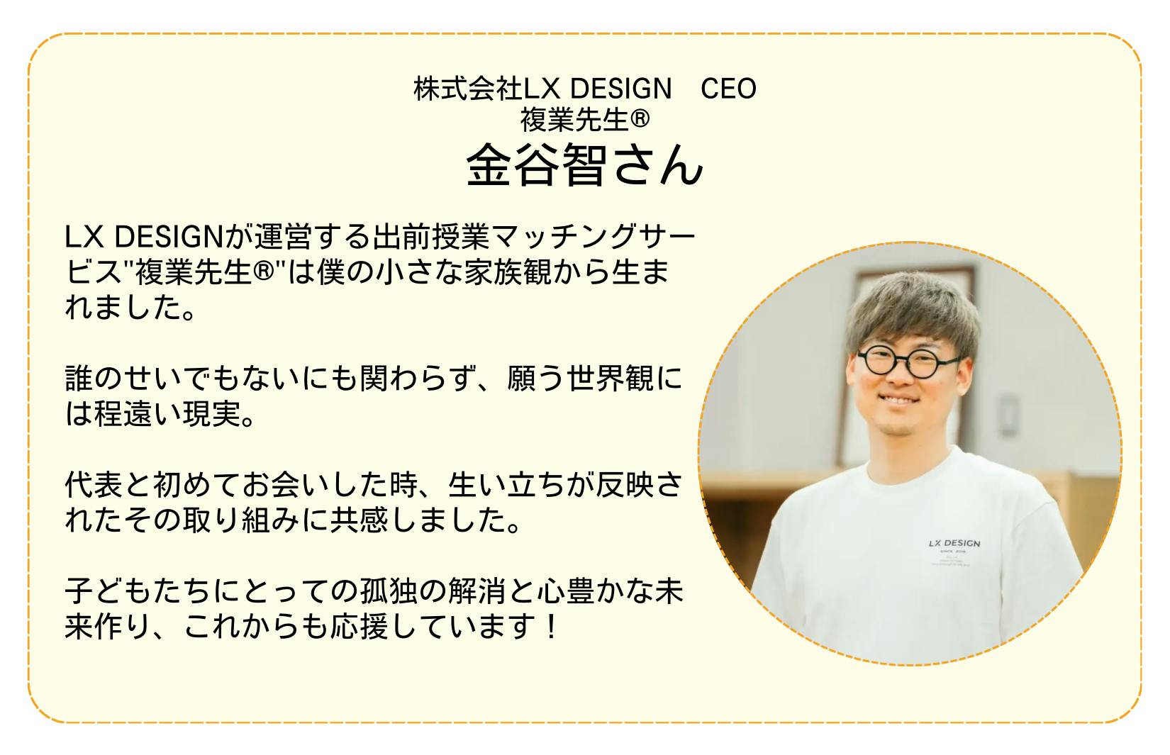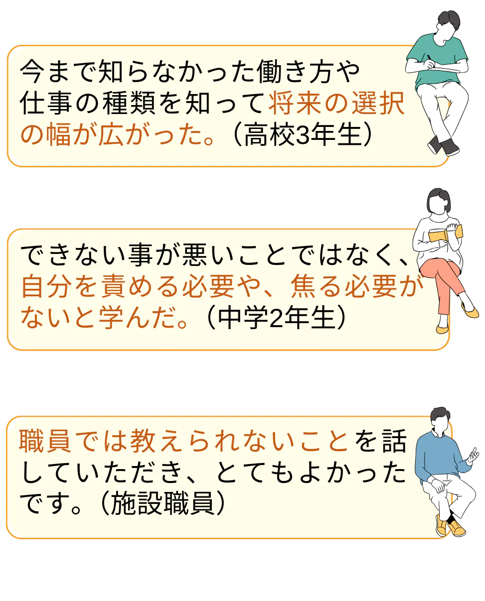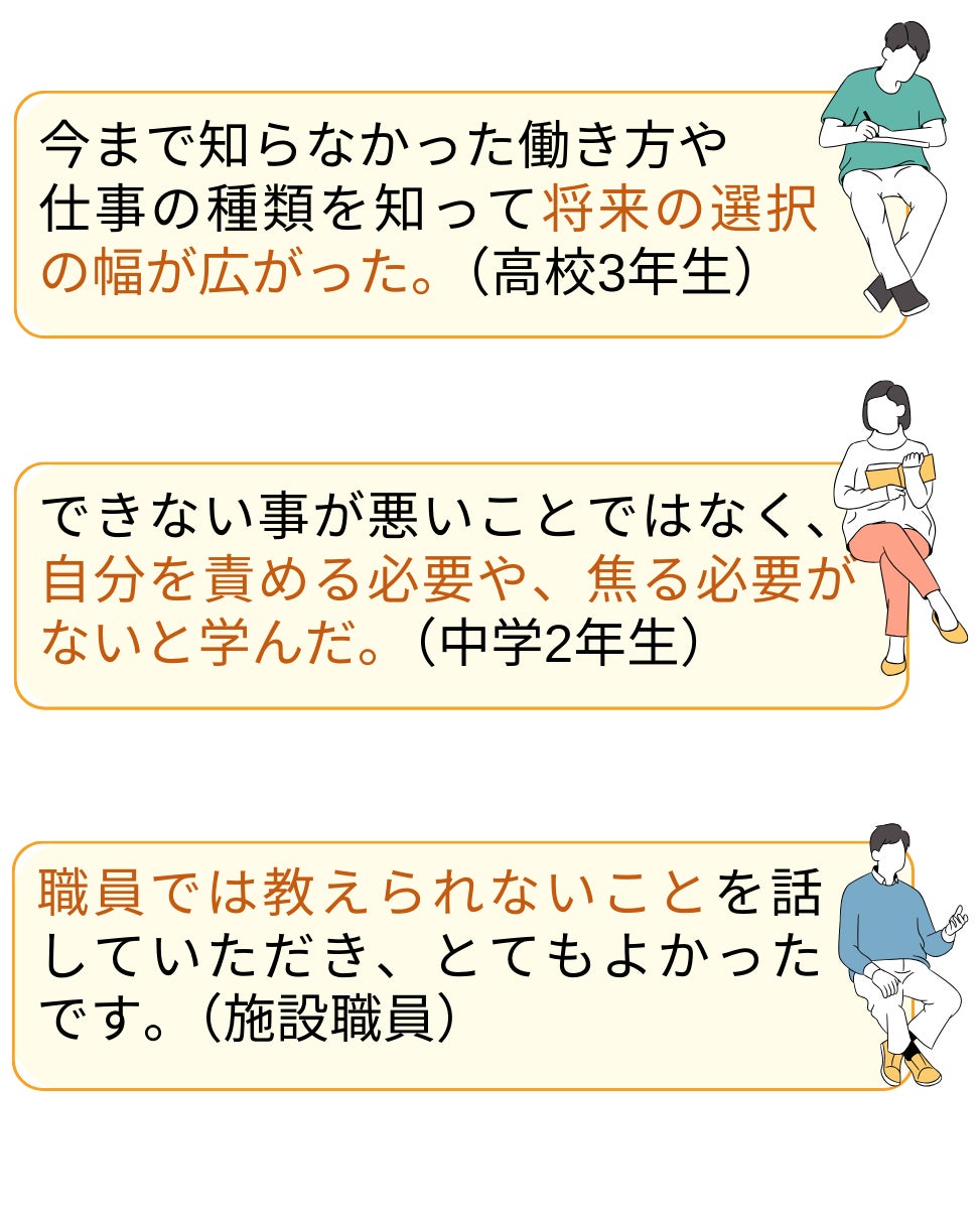 子どもたちがこれから出ていく社会で生きる、様々な大人たちから「こんな働き方、生き方もあるよ」「失敗しても大丈夫だよ」という言葉が届くだけで、働くこと、社会に出ることのハードルが下がり、より広い視野で選択ができると思うのです。