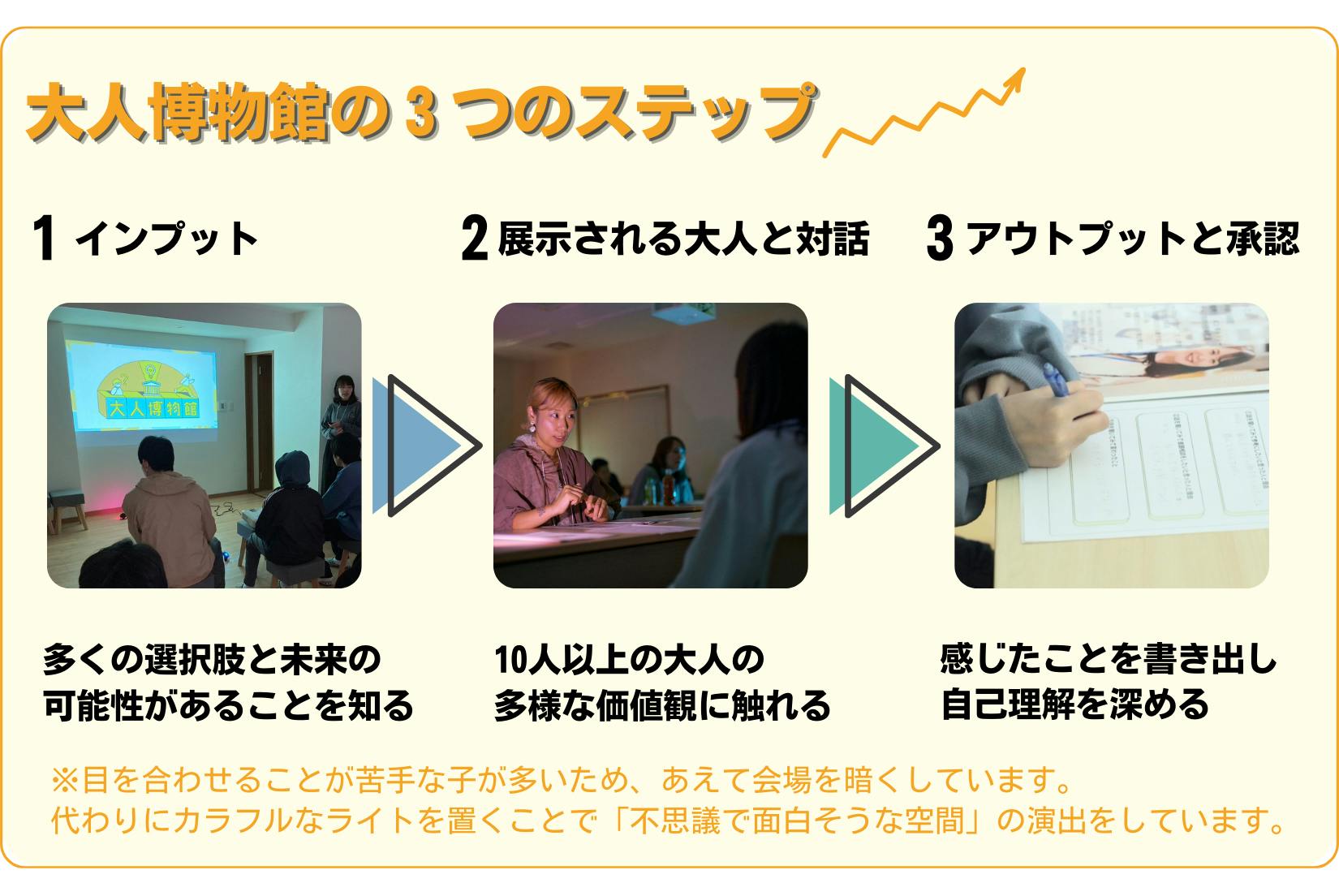 毎回10人以上の大人を展示するため、仮に中学1年生から高校3年生までの6年間参加を続けた子どもは、60人以上の大人と出会うことができるのです。