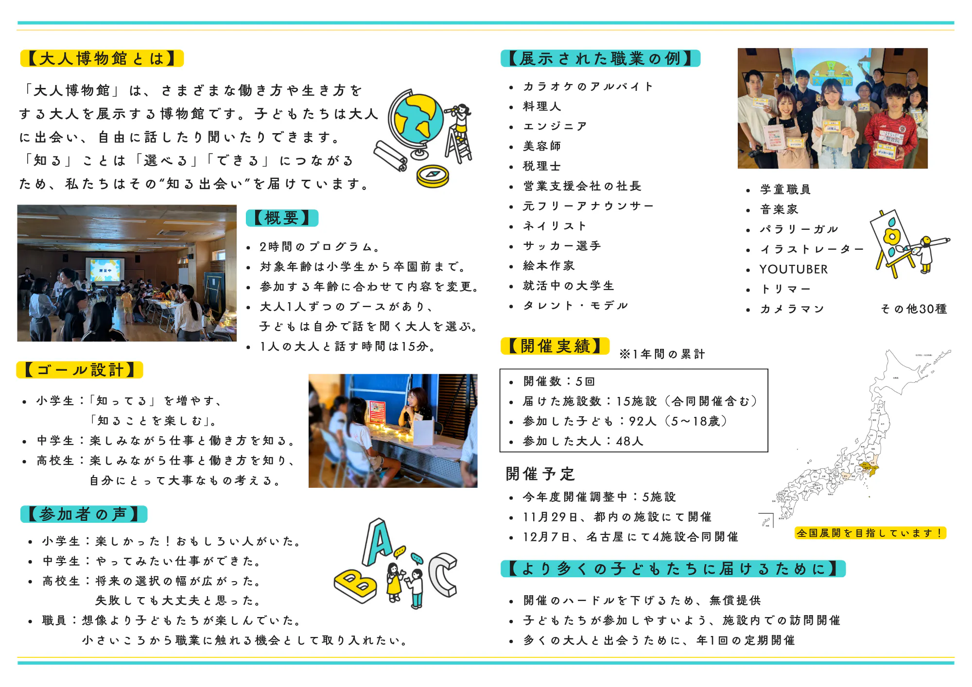 児童養護施設施設に訪問し、出張開催する移動型の博物館です。展示されるのは、様々な働き方、生き方をしている大人たち。子どもたちは博物館を自由に回り、大人たちの経験や職業観を聞きます。