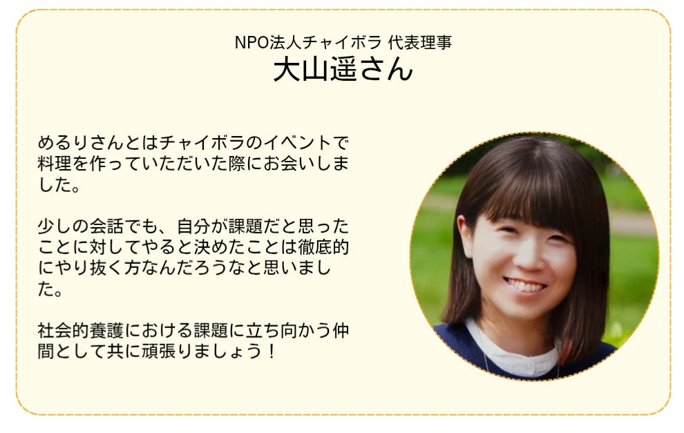 NPO法人チャイボラ 代表理事の大山さんより応援メッセージを頂きました!