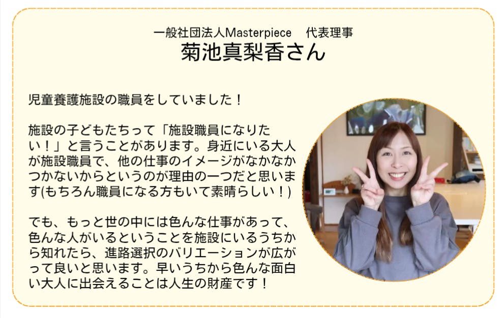 一般社団法人Masterpiece 代表理事の菊池真梨香さんより、応援メッセージを頂きました!