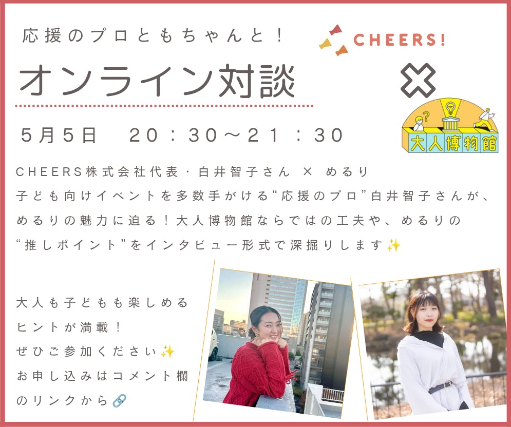 イベント告知・5月5日 20:30~21:30・オンライン/参加無料CHEERS代表のともちゃんとオンラインで対談をします!!ともちゃんは応援のプロ。大人子ども関わらずその人らしさを輝かせてくれる方です私も3月からCHEERSのシェフとして働きながら、時間を共有し、学びになることばかりです。そんなともちゃんが、今回はインタビュー形式で対談をしてくれます!!!!私自身が気づかない魅力や、本音が溢れるような気がしています☀申し込みはこちらのリンクから!https://docs.google.com/forms/d/1BR5bBvr0Sv3uVJ3Z-h5AH3mWLn4KDUr8vQKqTx_Fb7A/edit?usp=drivesdk皆様お待ちしております〜。