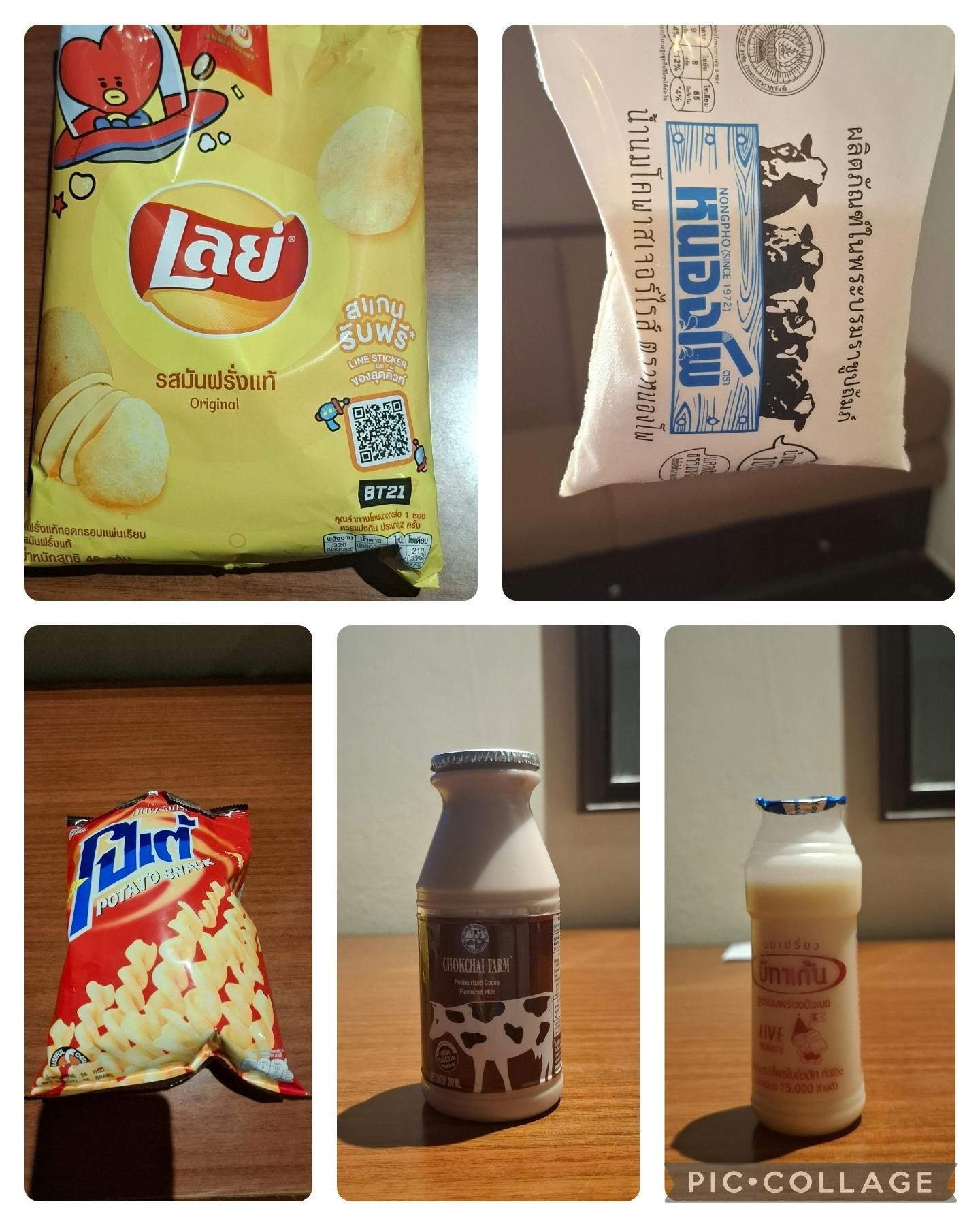 左上がポテトチップス左下がポテトのスナック両方とも20バーツ(約89円)スナック菓子は日本より高いと思います。これがスーパーでは最低の値段で他のはもっと高い。上の段の右は牛乳200ミリリットル、13バーツ(約58円)袋に入っているので切ってもらってストローで飲みます。下の段の真ん中はコーヒー牛乳かと思いきやチョコレート味の牛乳です。甘かったです。そのとなりは乳酸菌飲料です。値段忘れてしまった……。日本のヤクルトと一緒です。つづく