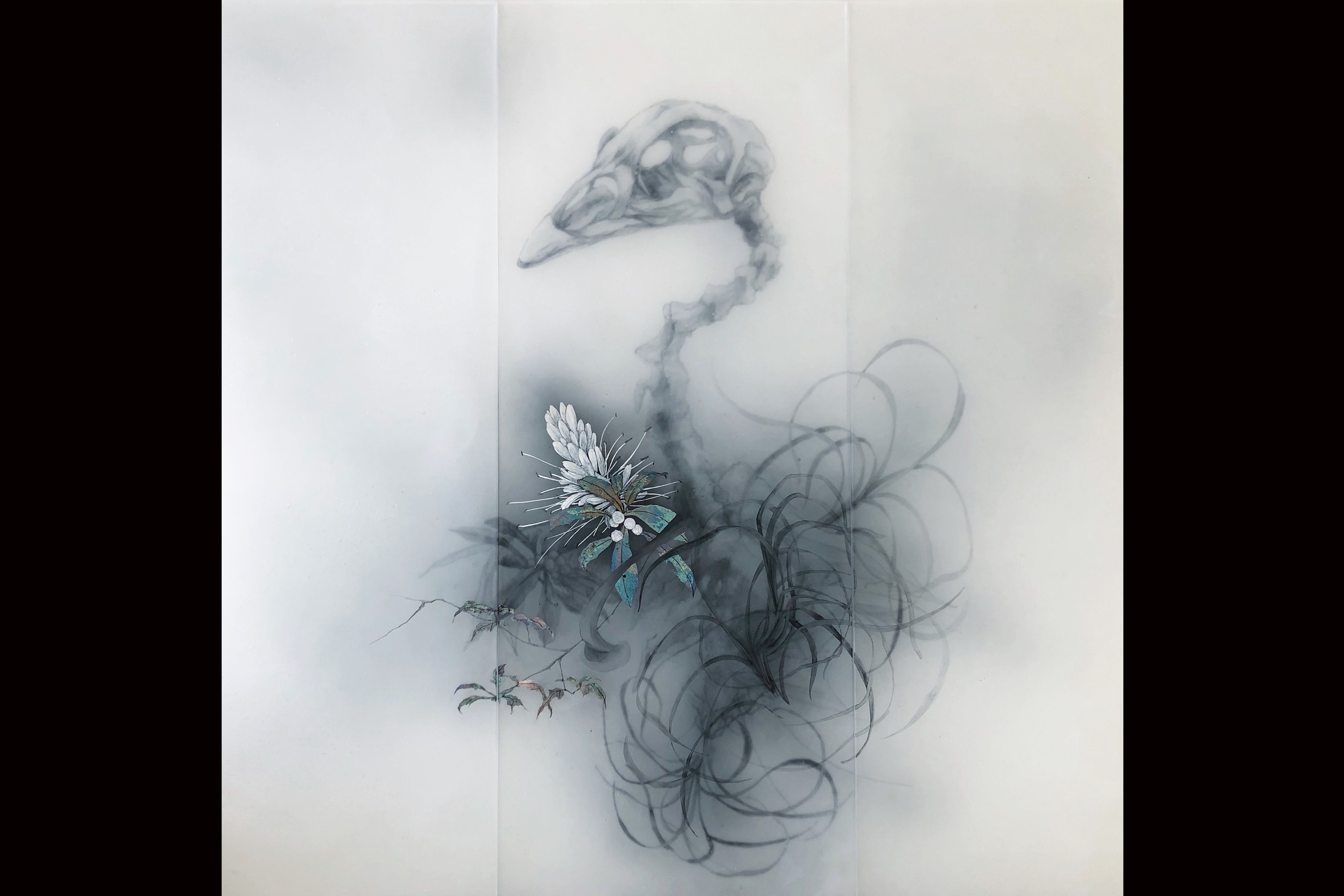 そもそも、なぜ、墨絵なの?って思いますよね。実は私、高校で普通科の美術コースに通っていたのですが、そこで日本画を学んだんです。いわば、私の創作のルーツなんですよ。「デッサンや、色の重ねで独自の色みを作り出す技法の勉強になる」と先生から言われたのですが、確かにそのときに築いた基礎力は、今でも役立っているように思います。他に水彩画や油絵、コラージュなどいろいろな画法を学びましたが、その頃から寒色系の色使いや植物の題材、レイヤーを使った作風が多かったように思います。