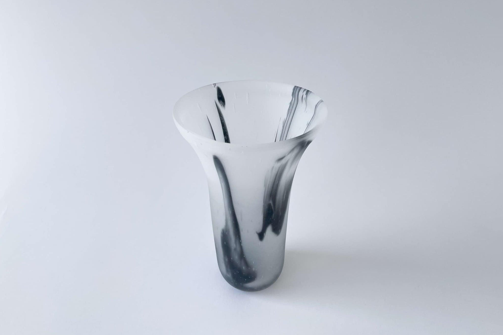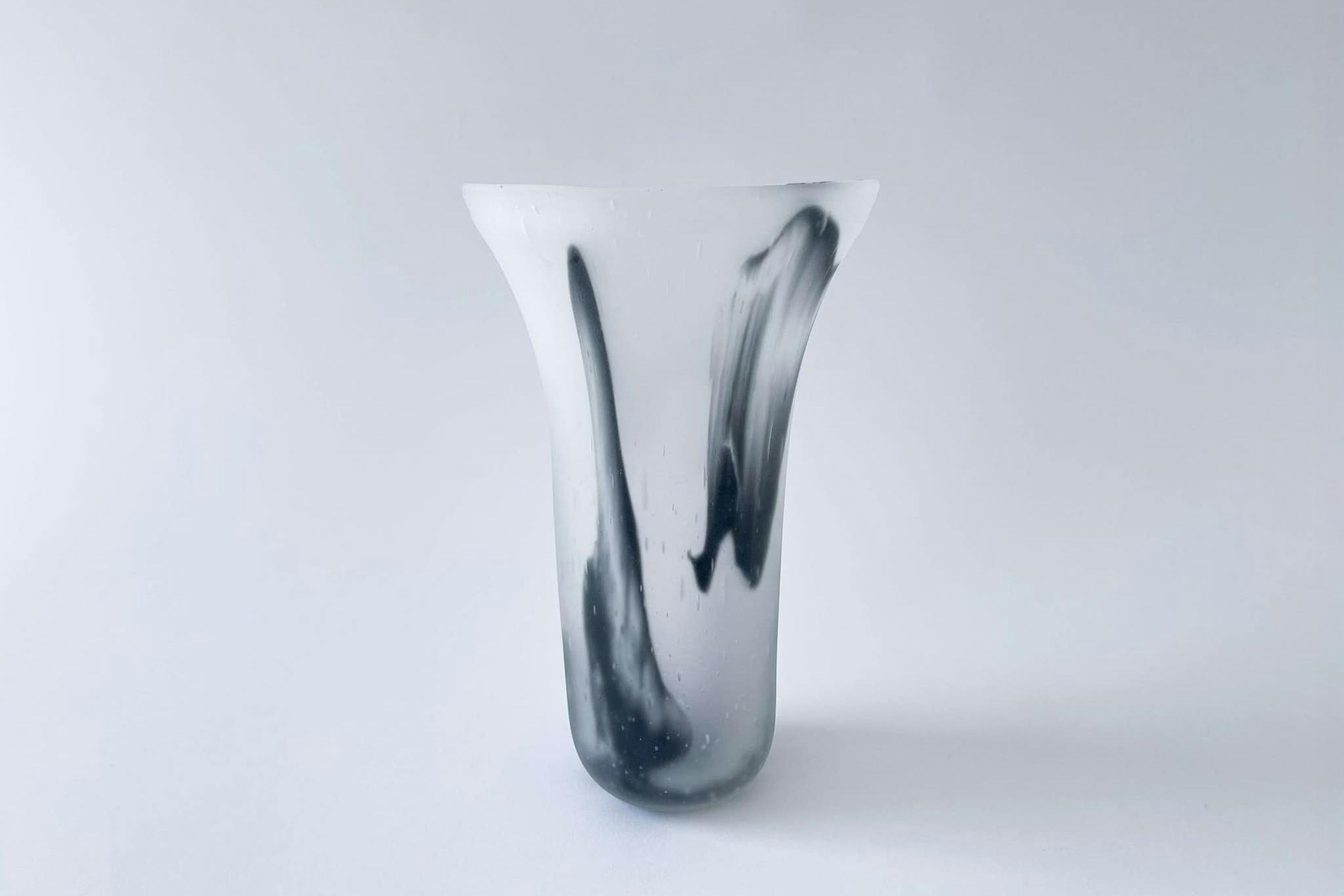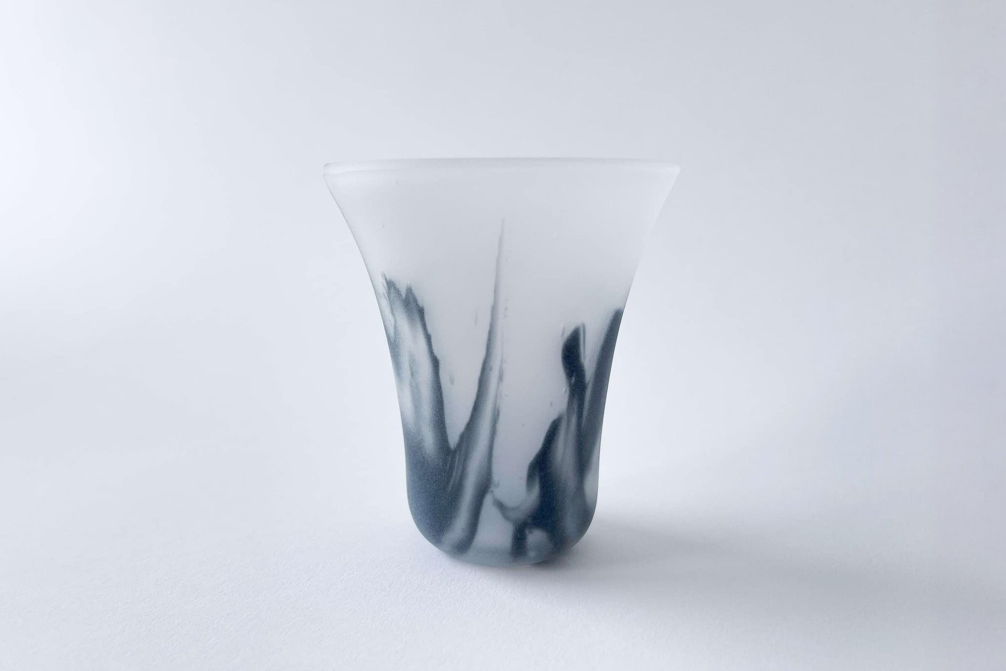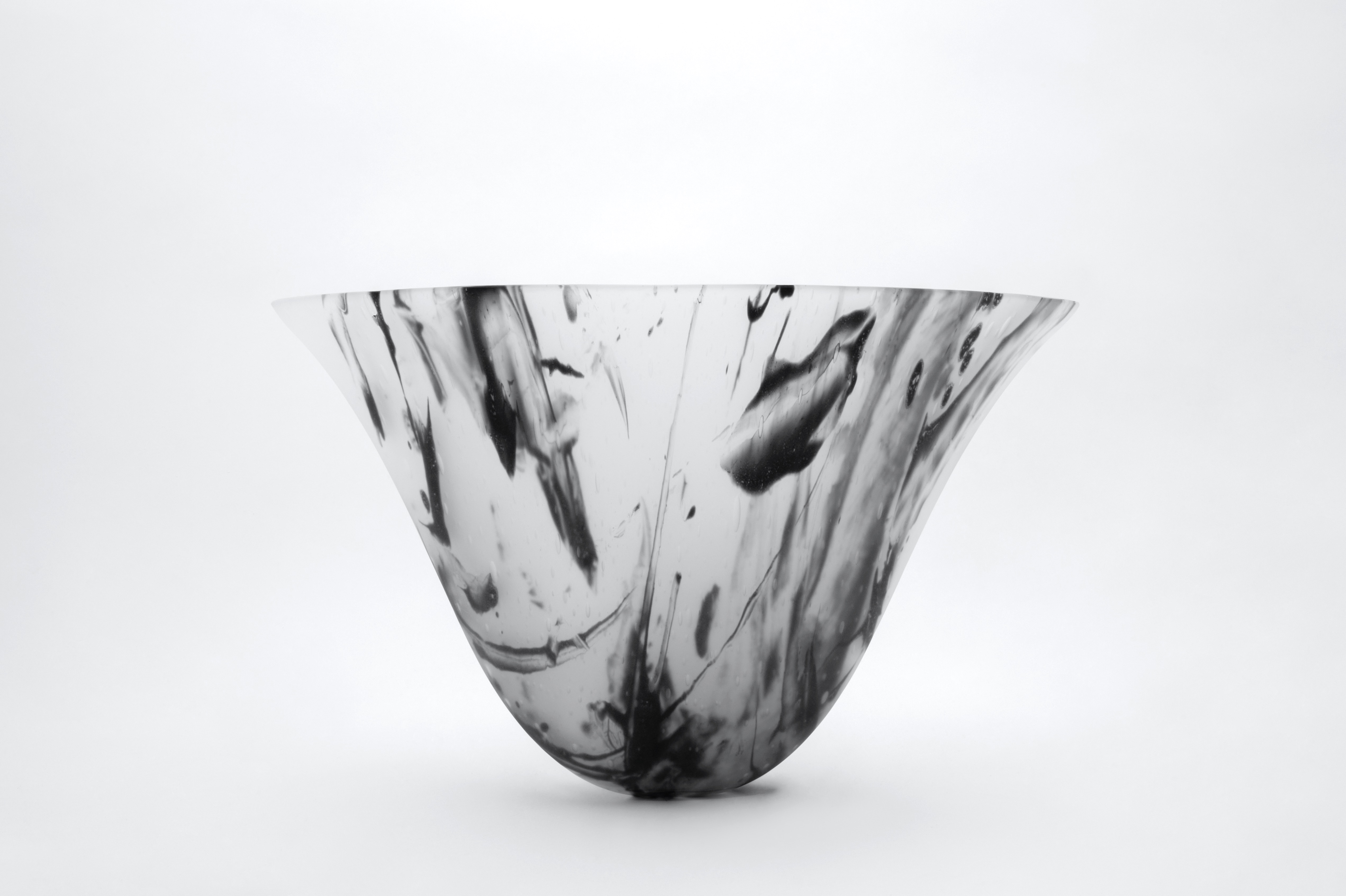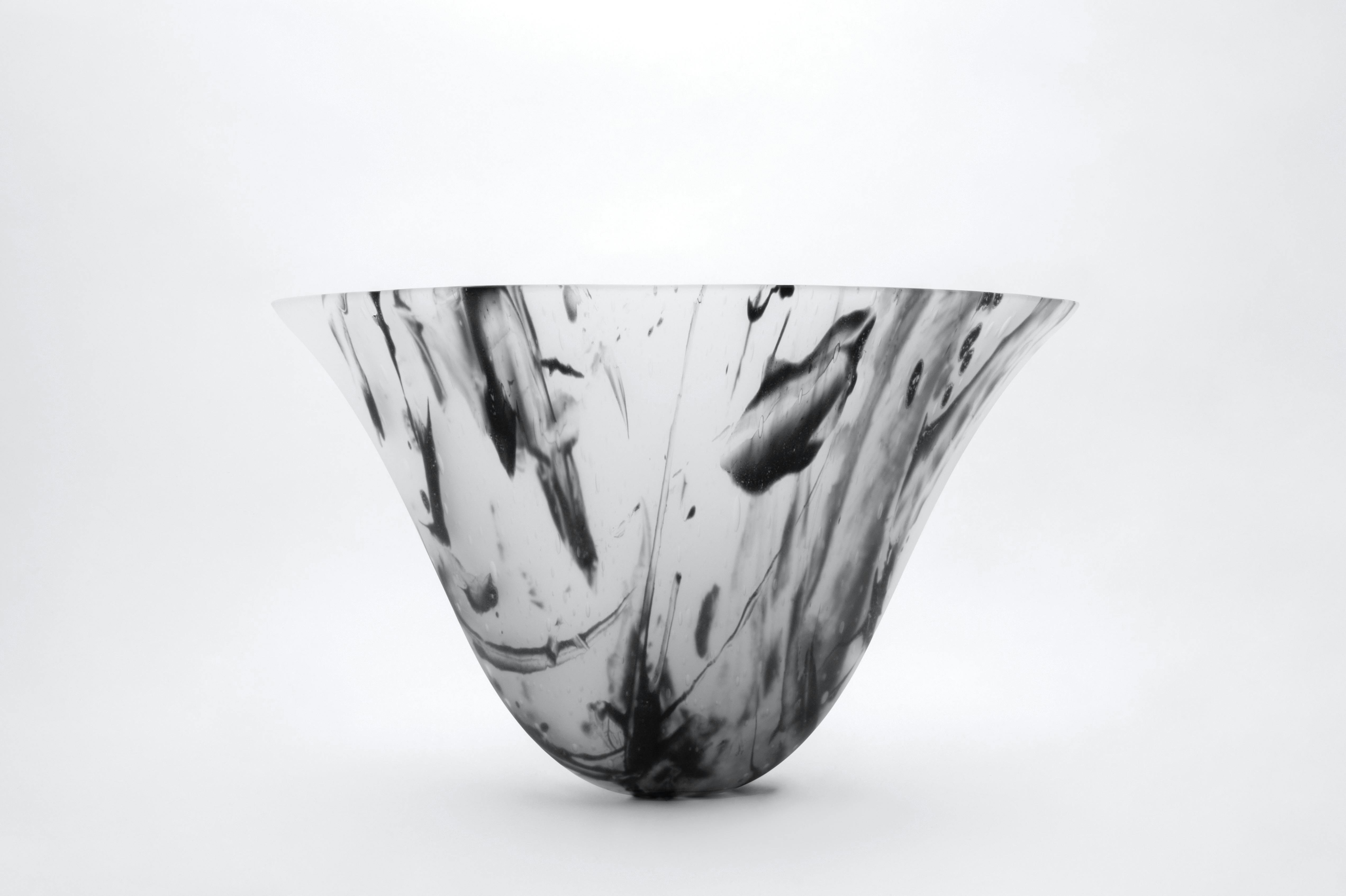 吹きガラスではないのに、どうやって器状にしているの? と思われるかもしれません。これは「サギング」という手法で作りました。円い穴の空いた板状の石膏型の上に、板ガラスを載せて電気窯で加熱すると、柔らかくなったガラス板がその穴を通ってダラーンと半円形に垂れていく現象を利用しているんです。その後、口周りをカットして整え、表面全体をサンドブラストしてフロスト状に加工し、さらに手作業で表面を整えて仕上げています。つまり成形の段階でガラス板が縦に伸びるので、墨絵も縦に流れるような表現になるというわけです。この方法で作ると自分では意図しない模様が表れてくるので、とても面白く感じています。