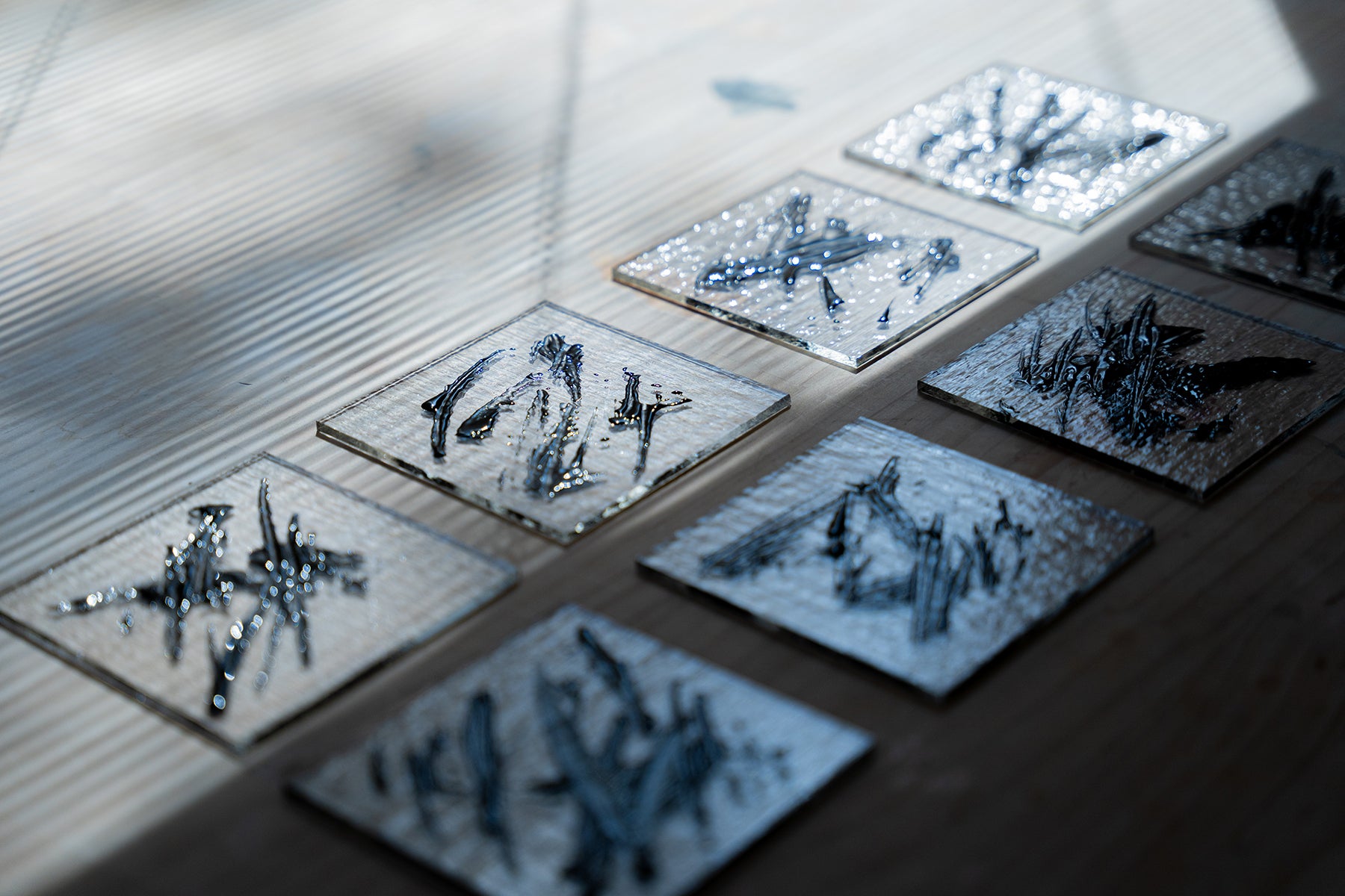 普段の作品作りでは、ガラスをキャンバスにして、墨や透明水彩絵具、胡粉と色鉛筆を組み合わせたものなどで、植物や鳥などをモチーフにした自然画や抽象画を主に描いています。こうした平面作品の他、板ガラス片をランダムに貼り合わせたオブジェや、植物の葉から直接型取りした石膏型を使ってガラスを鋳造し、彩色して、まるで本物の植物を抜き取ったかのような立体作品も作っています。元々、具象画を描くのが好きだったのですが、具象画は自分の意思が出過ぎるような気がだんだんしてきて、いったん離れたいという思いから、今は抽象画に移行しています。抽象画の良いところは、それを目にした人がそれぞれ好きなように解釈できること。Bokuシリーズの抽象模様もその一つなんです。