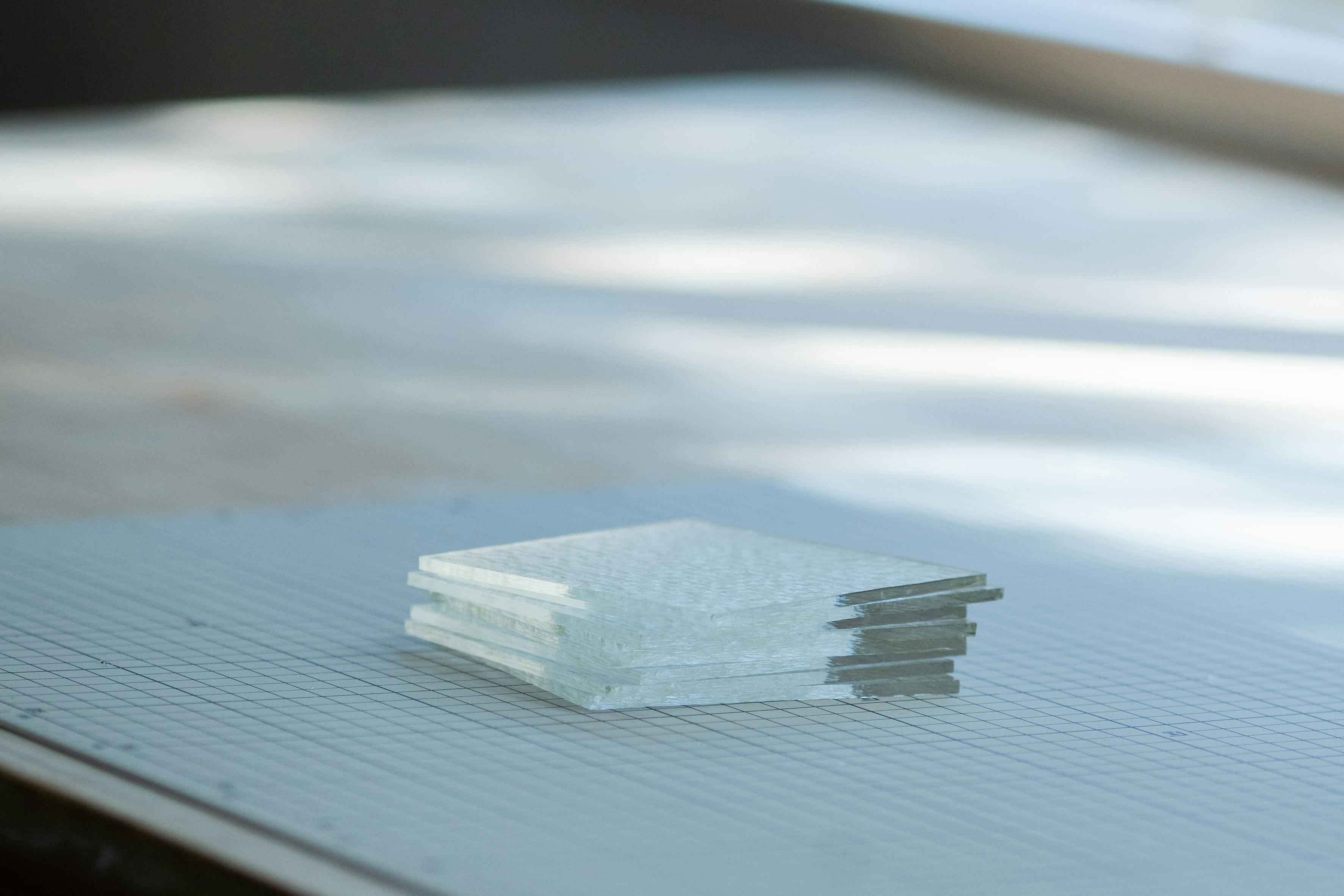キルンワークとは、代表的なガラス鋳造技法の一つです。まず石膏型を作り、そこに素となるガラス粒子や板を充填し、電気窯で焼成して造形します。一方、吹きガラスは吹き竿の先端に熔けたガラスを巻き付けて、窯の前で息を吹いて膨らませながら成形する方法です。こちらは瞬間的に成形できることから量産に向いているのですが、窯をずっと焚き続けないといけないので維持費が掛かり、また成形には手助けする人が必ず必要なのでチームワーク力が問われます。その点で、私は自分一人だけの手で、時間をかけて制作を行えるキルンワークの方が性に合っているんですね。