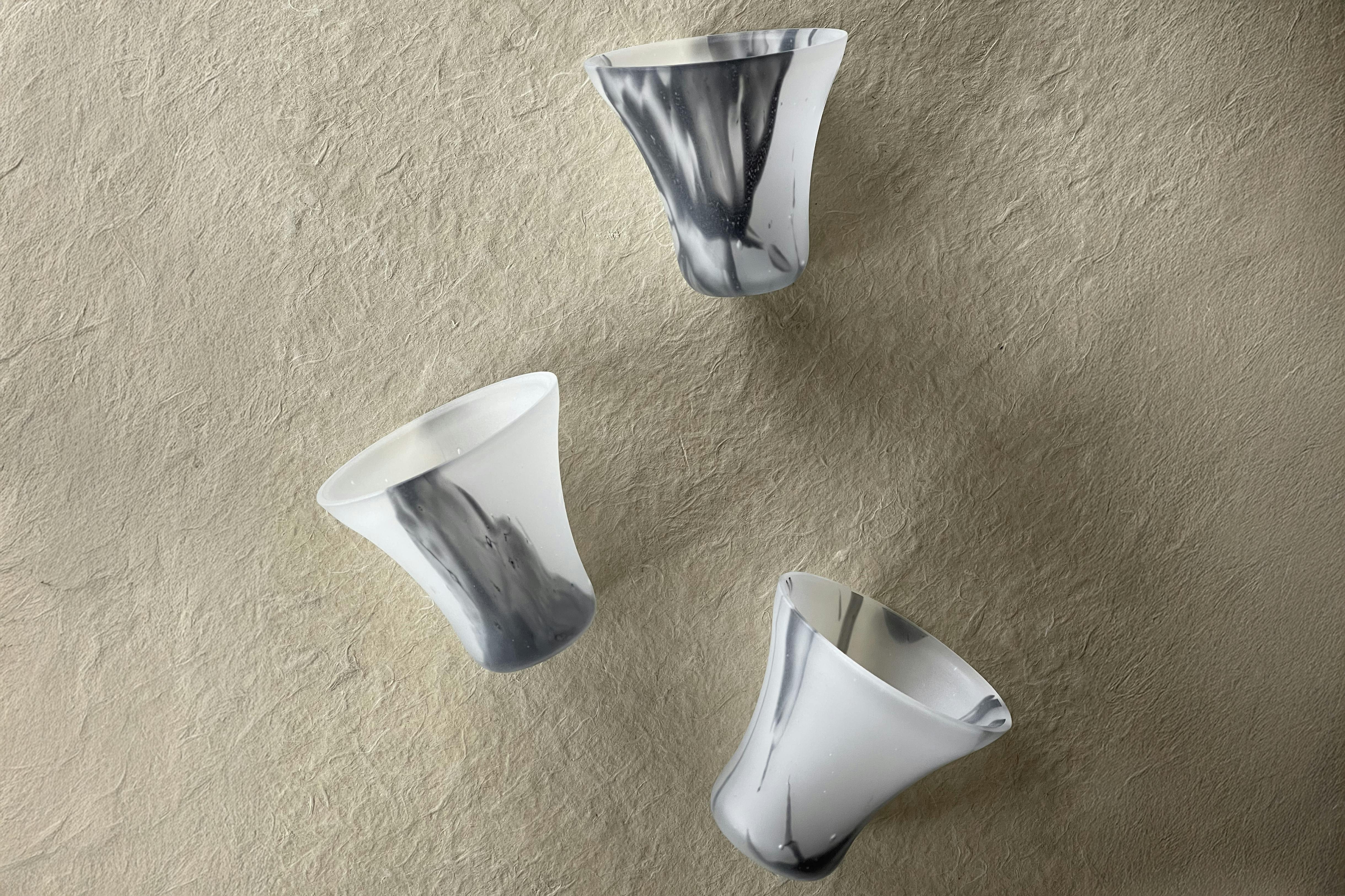 そんな私がアートを基盤にしながら、プロダクト製作にチャレンジしました。私の代表的な作風である墨絵をモチーフに「Boku」シリーズとして酒器を開発したんです。一つはビアグラスで、350㎖容量の缶ビールを注ぐと、ちょうど泡まできれいに収まるサイズになるよう工夫しました。もう一つはぐい呑みで、日本酒を楽しむ器としてはもちろん、冷茶などを飲むのにも最適な大きさです。家でお酒を楽しみながら、小さなアート作品に触れてほしいという思いで考案しました。