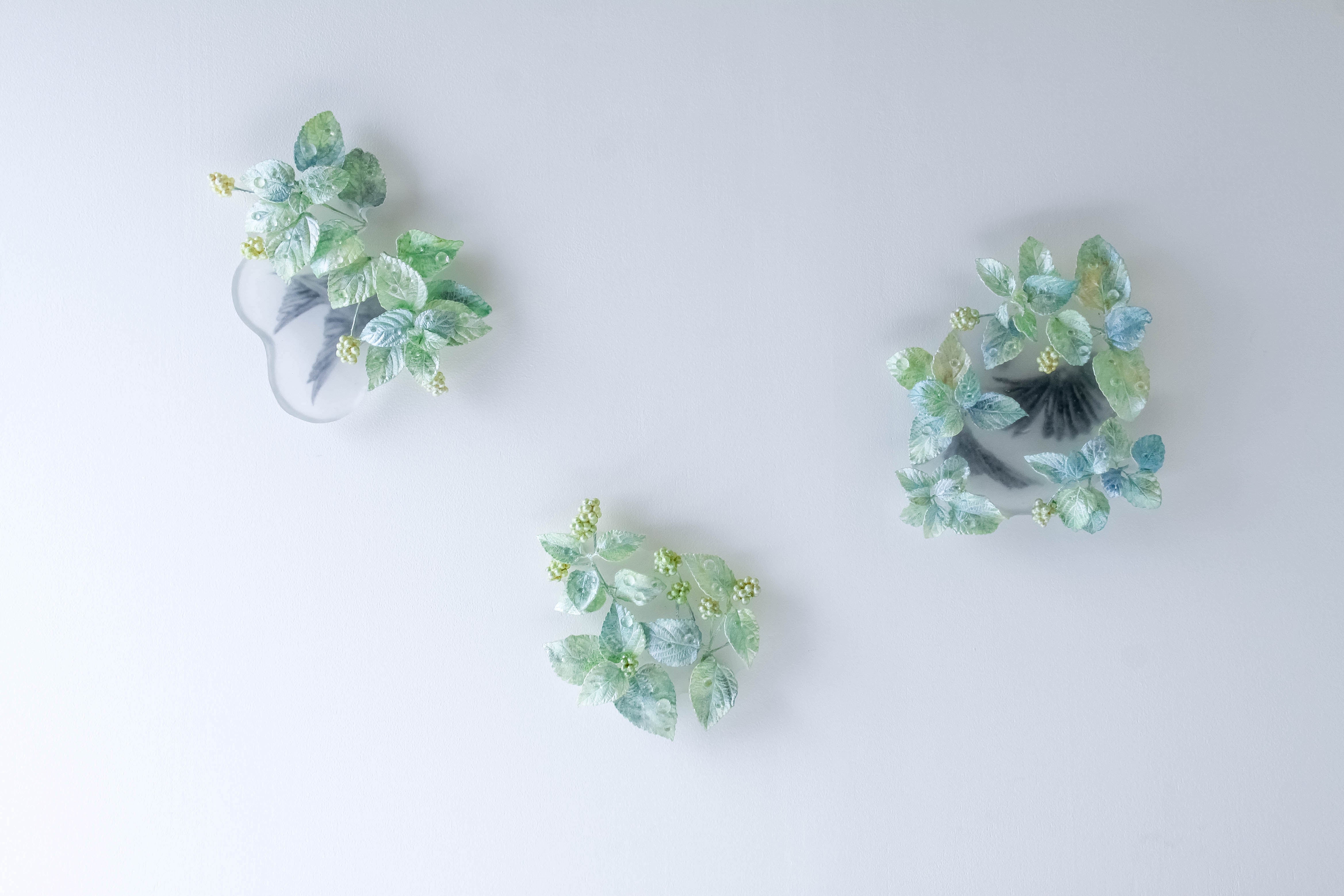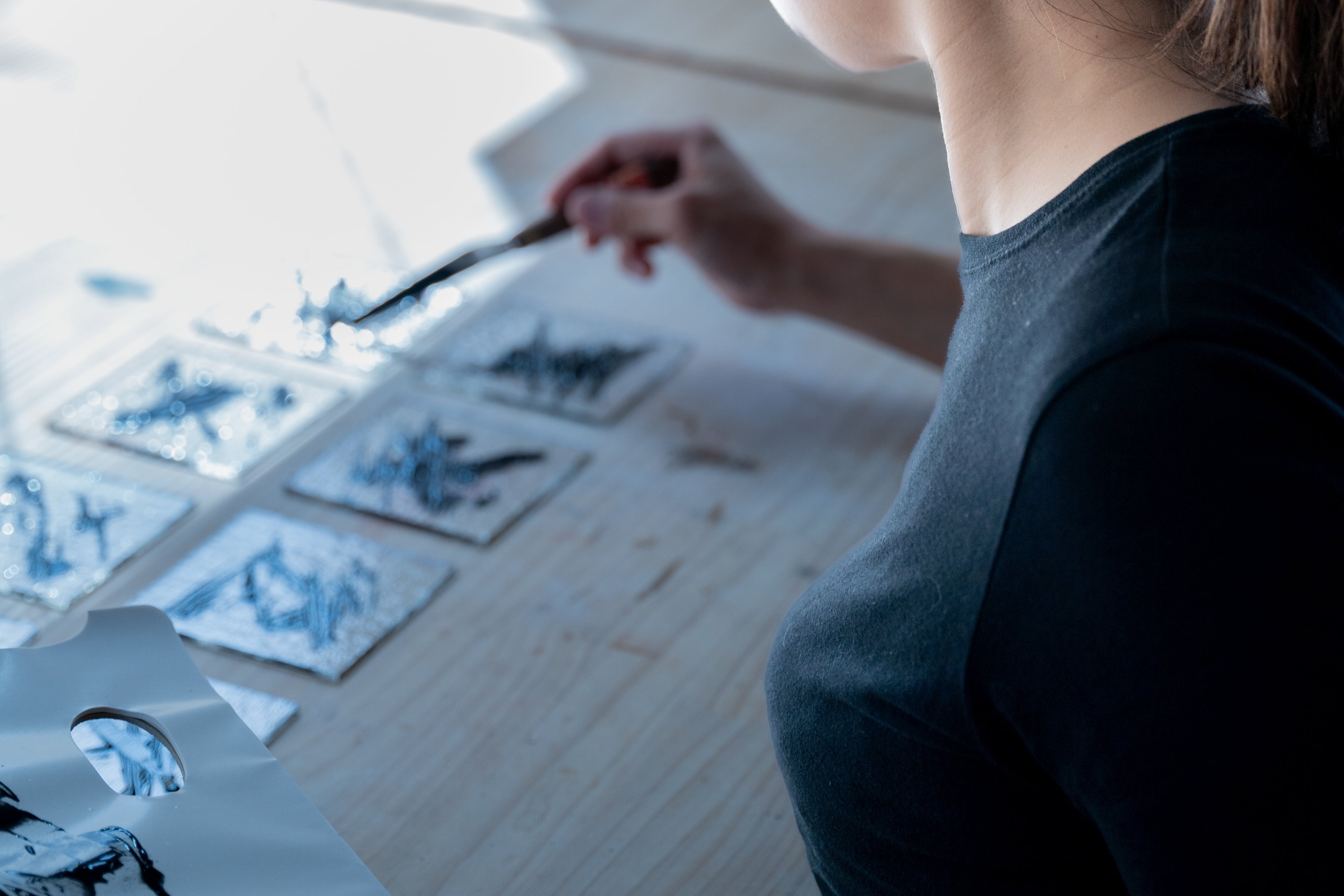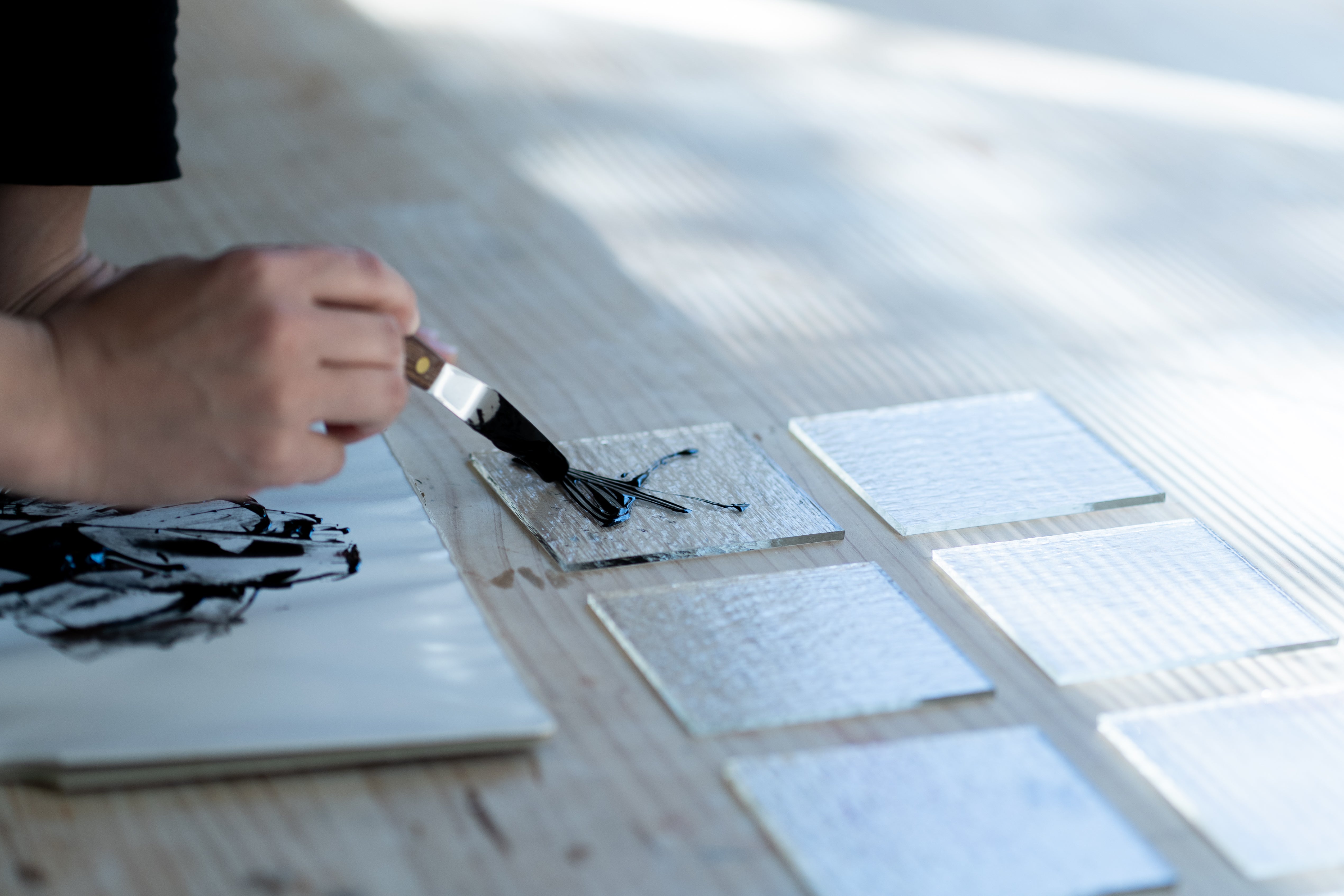 普段の作品作りでは、ガラスをキャンバスにして、墨や透明水彩絵具、胡粉と色鉛筆を組み合わせたものなどで、植物や鳥などをモチーフにした自然画や抽象画を主に描いています。こうした平面作品の他、板ガラス片をランダムに貼り合わせたオブジェや、植物の葉から直接型取りした石膏型を使ってガラスを鋳造し、彩色して、まるで本物の植物を抜き取ったかのような立体作品も作っています。元々、具象画を描くのが好きだったのですが、具象画は自分の意思が出過ぎるような気がだんだんしてきて、いったん離れたいという思いから、今は抽象画に移行しています。抽象画の良いところは、それを目にした人がそれぞれ好きなように解釈できること。Bokuシリーズの抽象模様もその一つなんです。