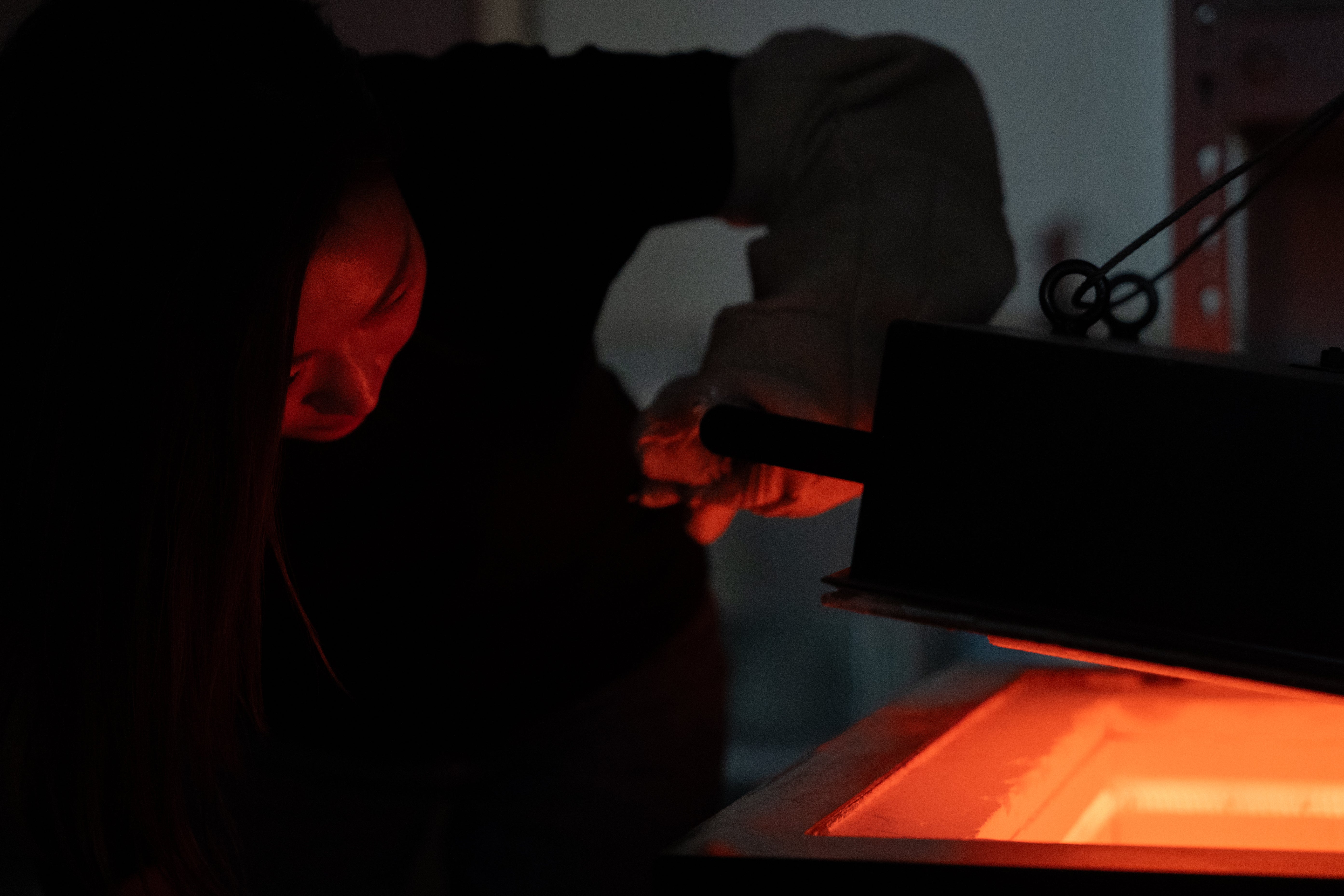 キルンワークとは、代表的なガラス鋳造技法の一つです。まず石膏型を作り、そこに素となるガラス粒子や板を充填し、電気窯で焼成して造形します。一方、吹きガラスは吹き竿の先端に熔けたガラスを巻き付けて、窯の前で息を吹いて膨らませながら成形する方法です。こちらは瞬間的に成形できることから量産に向いているのですが、窯をずっと焚き続けないといけないので維持費が掛かり、また成形には手助けする人が必ず必要なのでチームワーク力が問われます。その点で、私は自分一人だけの手で、時間をかけて制作を行えるキルンワークの方が性に合っているんですね。