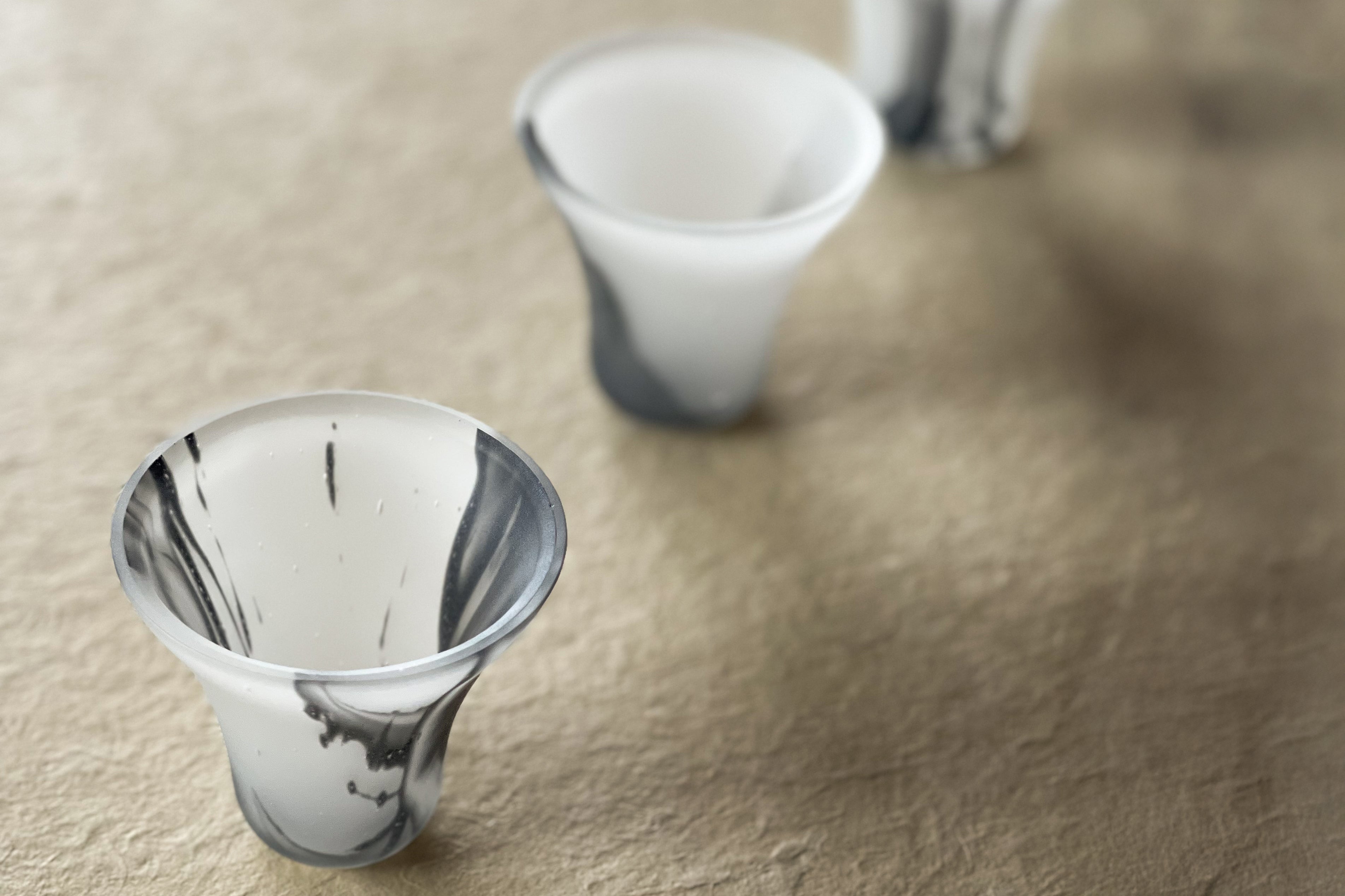 そんな私がアートを基盤にしながら、プロダクト製作にチャレンジしました。私の代表的な作風である墨絵をモチーフに「Boku」シリーズとして酒器を開発したんです。一つはビアグラスで、350㎖容量の缶ビールを注ぐと、ちょうど泡まできれいに収まるサイズになるよう工夫しました。もう一つはぐい呑みで、日本酒を楽しむ器としてはもちろん、冷茶などを飲むのにも最適な大きさです。家でお酒を楽しみながら、小さなアート作品に触れてほしいという思いで考案しました。