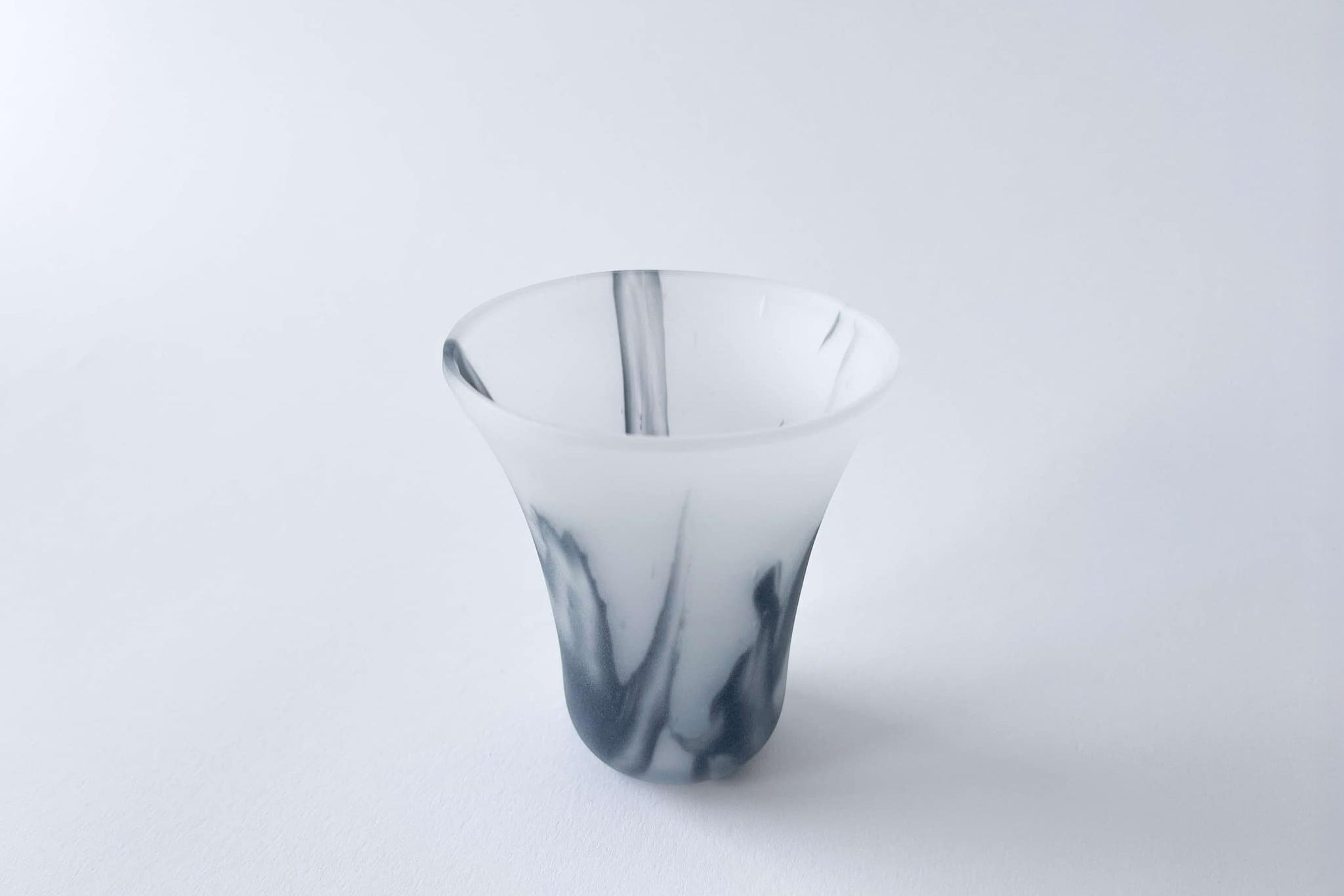 吹きガラスではないのに、どうやって器状にしているの? と思われるかもしれません。これは「サギング」という手法で作りました。円い穴の空いた板状の石膏型の上に、板ガラスを載せて電気窯で加熱すると、柔らかくなったガラス板がその穴を通ってダラーンと半円形に垂れていく現象を利用しているんです。その後、口周りをカットして整え、表面全体をサンドブラストしてフロスト状に加工し、さらに手作業で表面を整えて仕上げています。つまり成形の段階でガラス板が縦に伸びるので、墨絵も縦に流れるような表現になるというわけです。この方法で作ると自分では意図しない模様が表れてくるので、とても面白く感じています。
