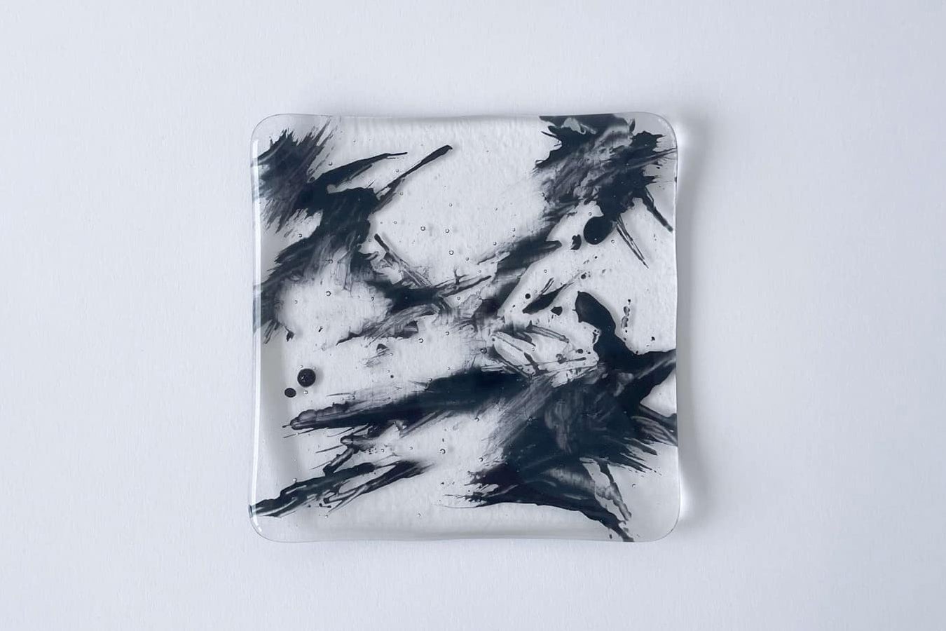ぐい呑みやビアグラスと同じ手法でガラス板に抽象模様を描いた「Boku角皿」です。おつまみを盛るなどしてぜひご活用ください。