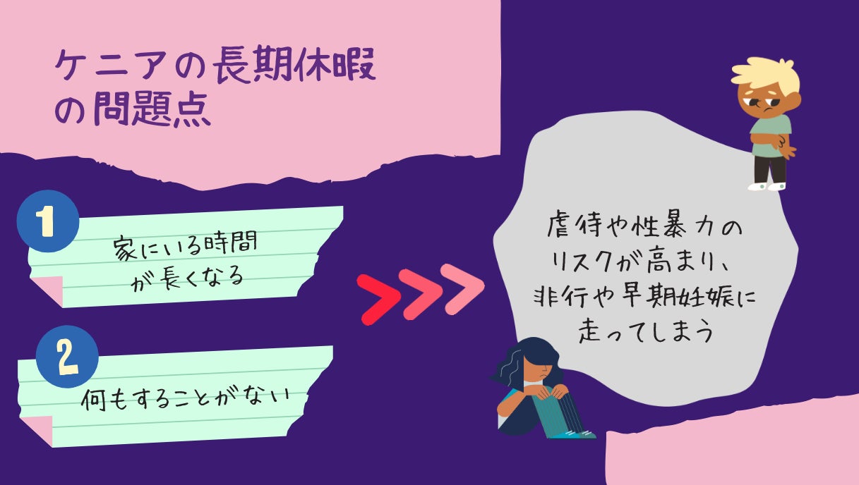 ケニアの学校の休暇は年間約4か月(4月、8月、11〜12月)。この期間、子どもたちは部活や習い事、塾など何もすることがなく無為に過ごしがちで、地域住民は危機感をもっています。