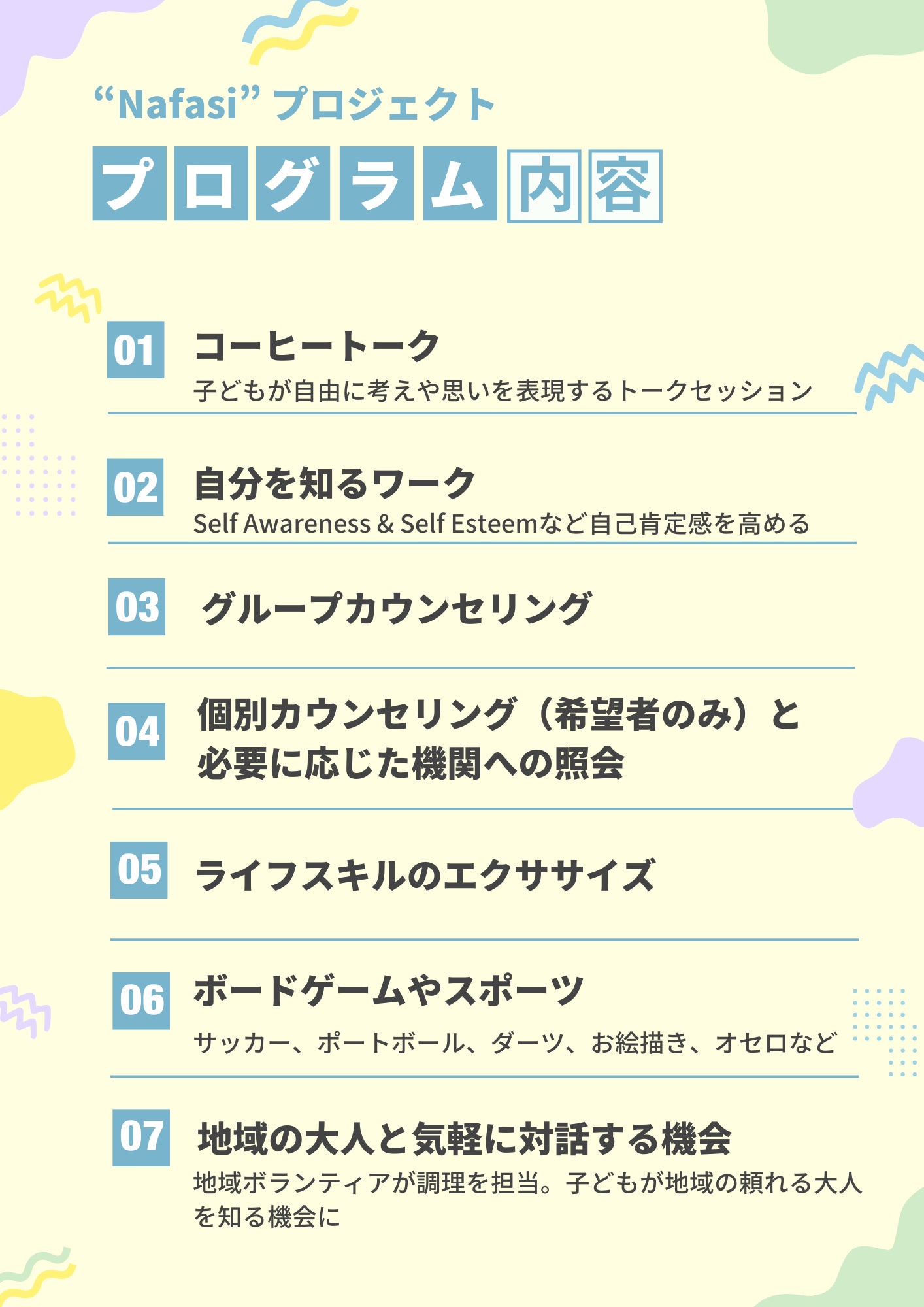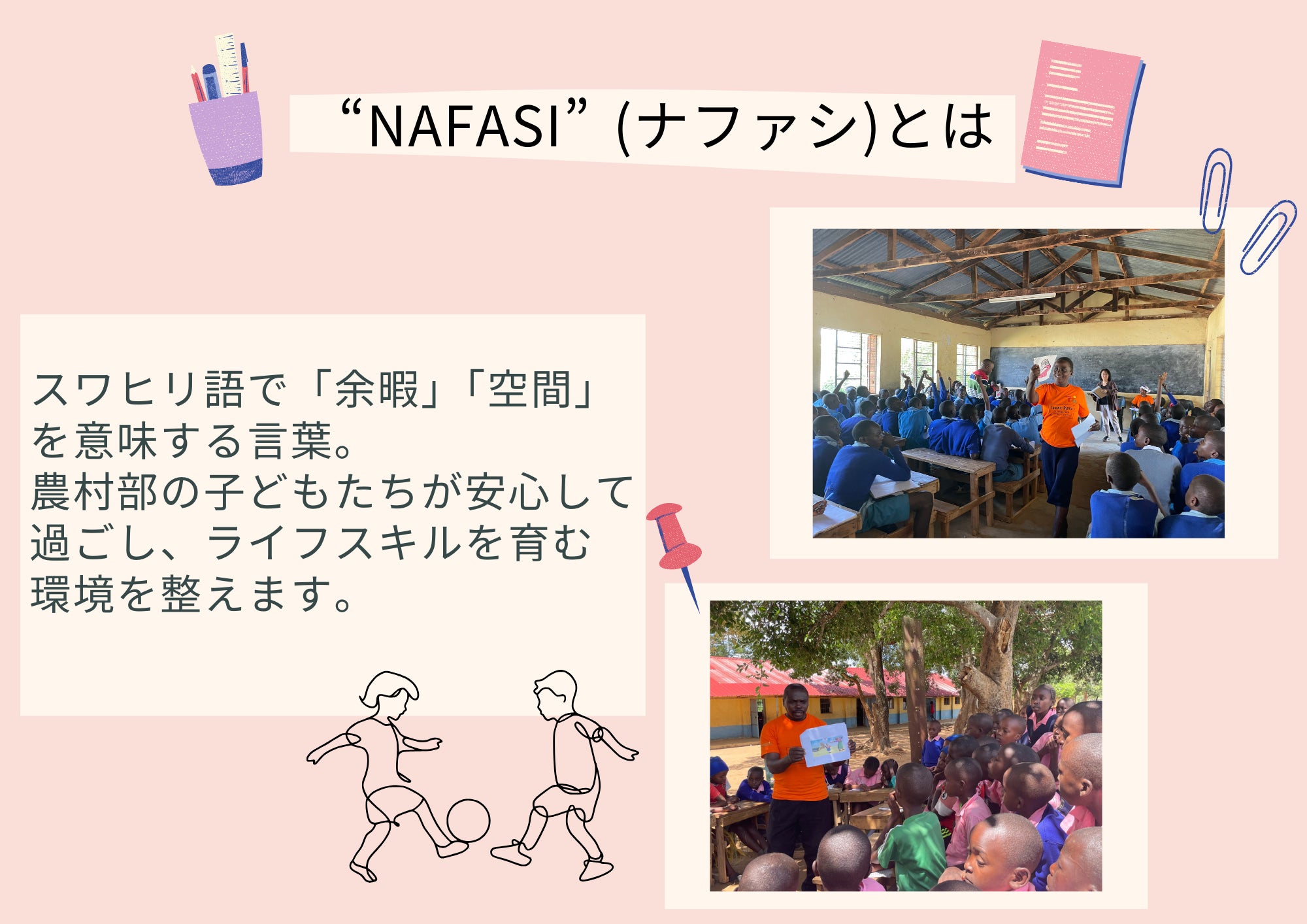 この現状を変えるために、私たちは「安心できる居場所=Nafasi(ナファシ)」を立ち上げます。ナファシとは、スワヒリ語で“場所・余暇”を意味します。