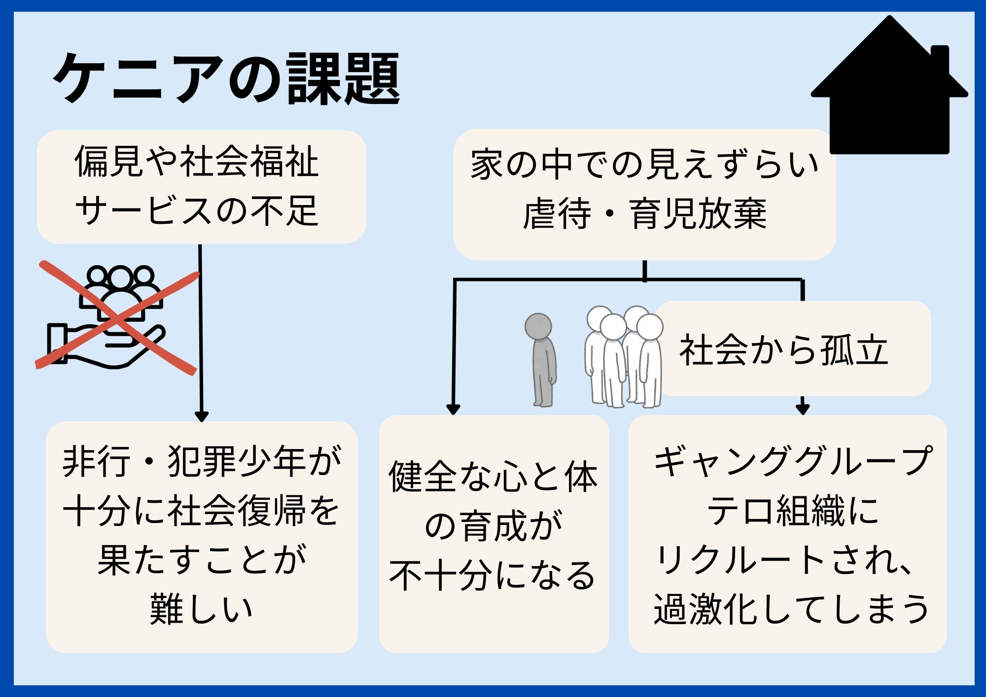 ケニアでは、偏見や社会福祉サービスの不足から、非行少年が十分に社会復帰を果たすことが難しい現状があります。