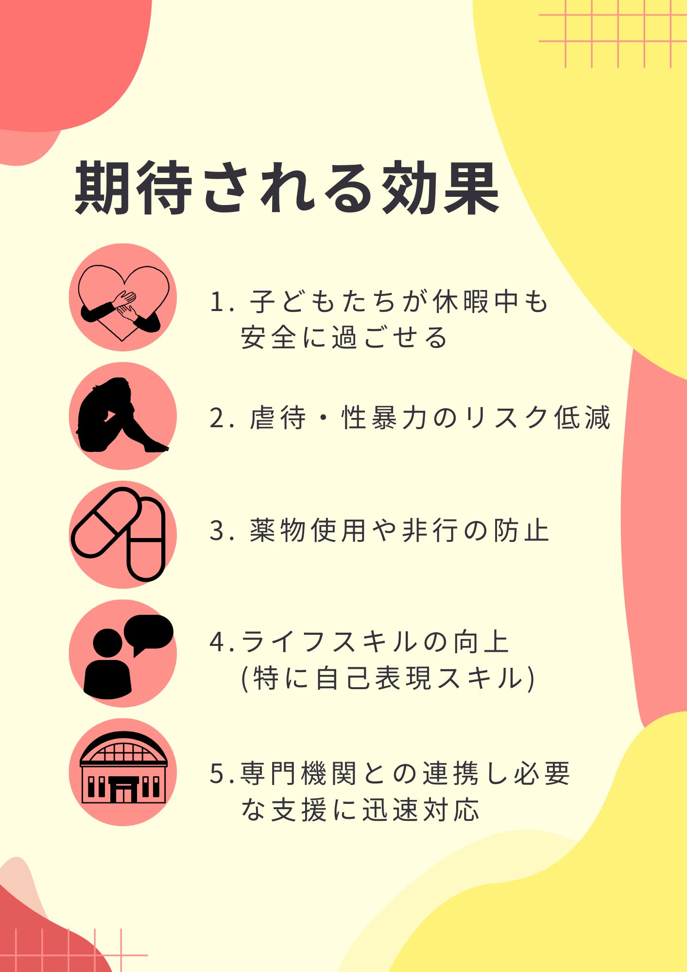 「長期休暇の後も居場所で学んだスキルで子どもたちが非行にNOと言える、困った時に相談できる人・場所とつなぐことで、子どもの明るい未来、平和な地域を目指します。」